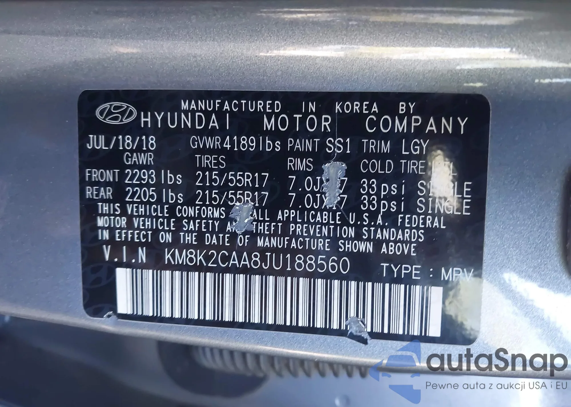 LOT: 43342340 VIN: KM8K2CAA8JU188560