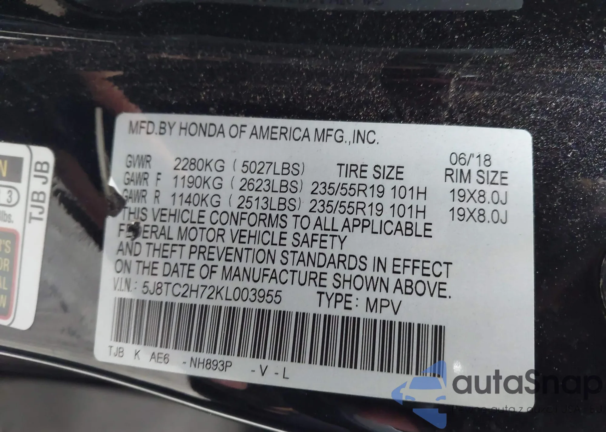 • VIN 5J8TC2H72KL003955