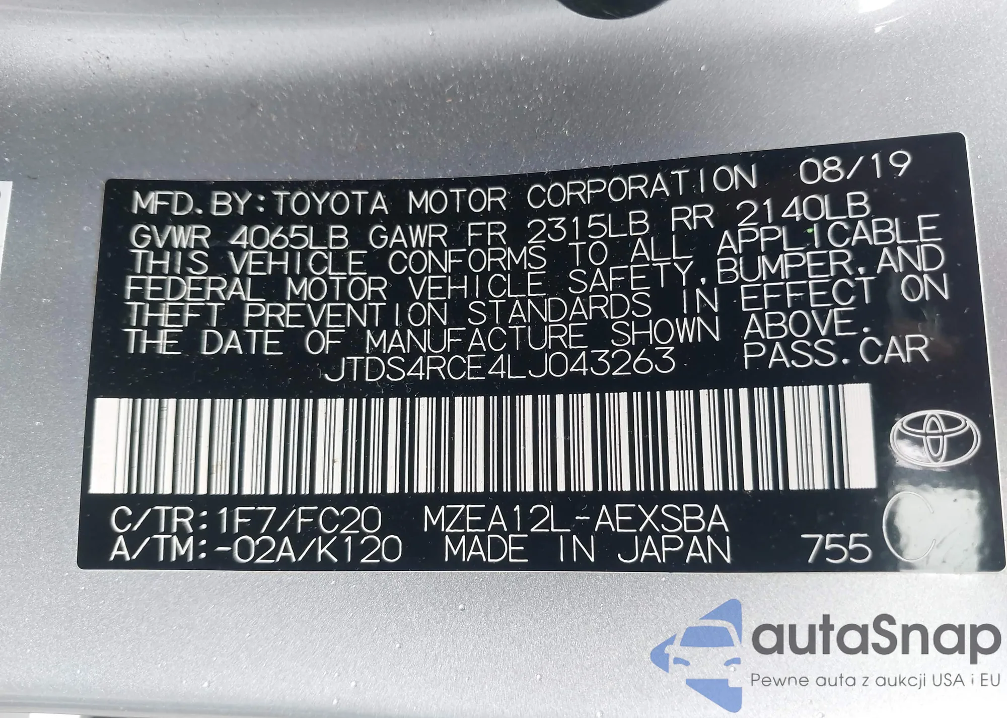 LOT: 43241562 VIN: JTDS4RCE4LJ043263