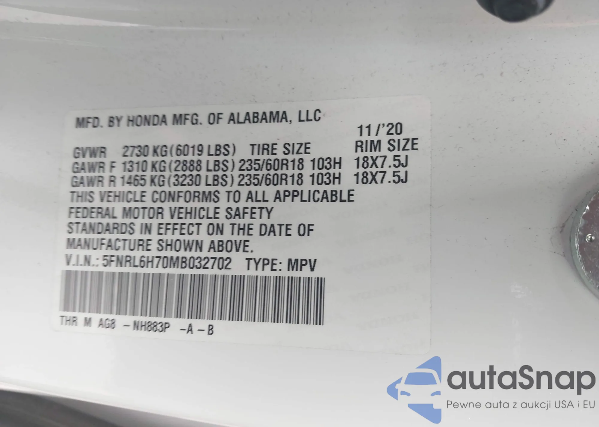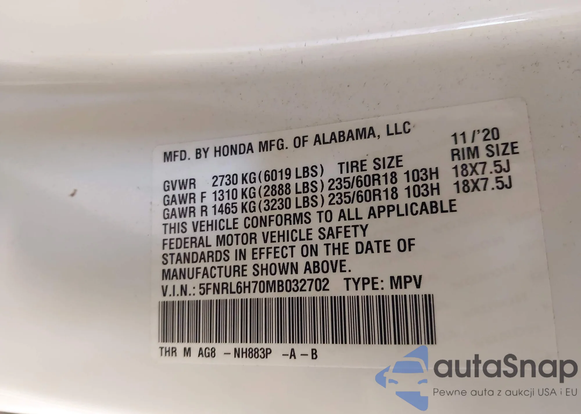 • VIN SHHFK7H3XKU214668
