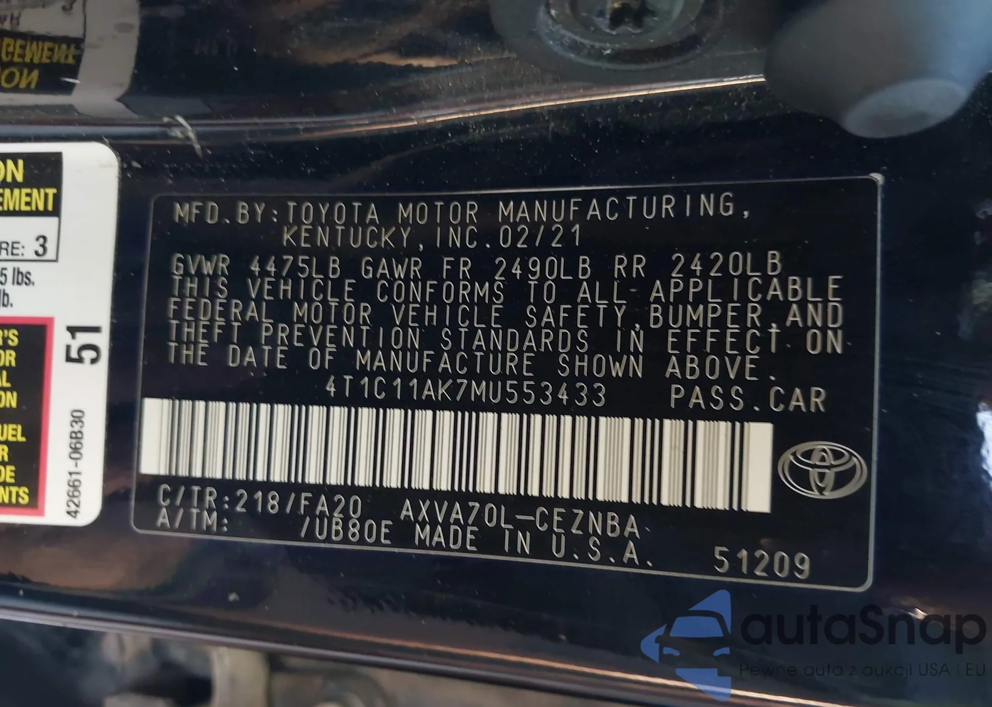 LOT: 43351213 VIN: 4T1C11AK7MU553433