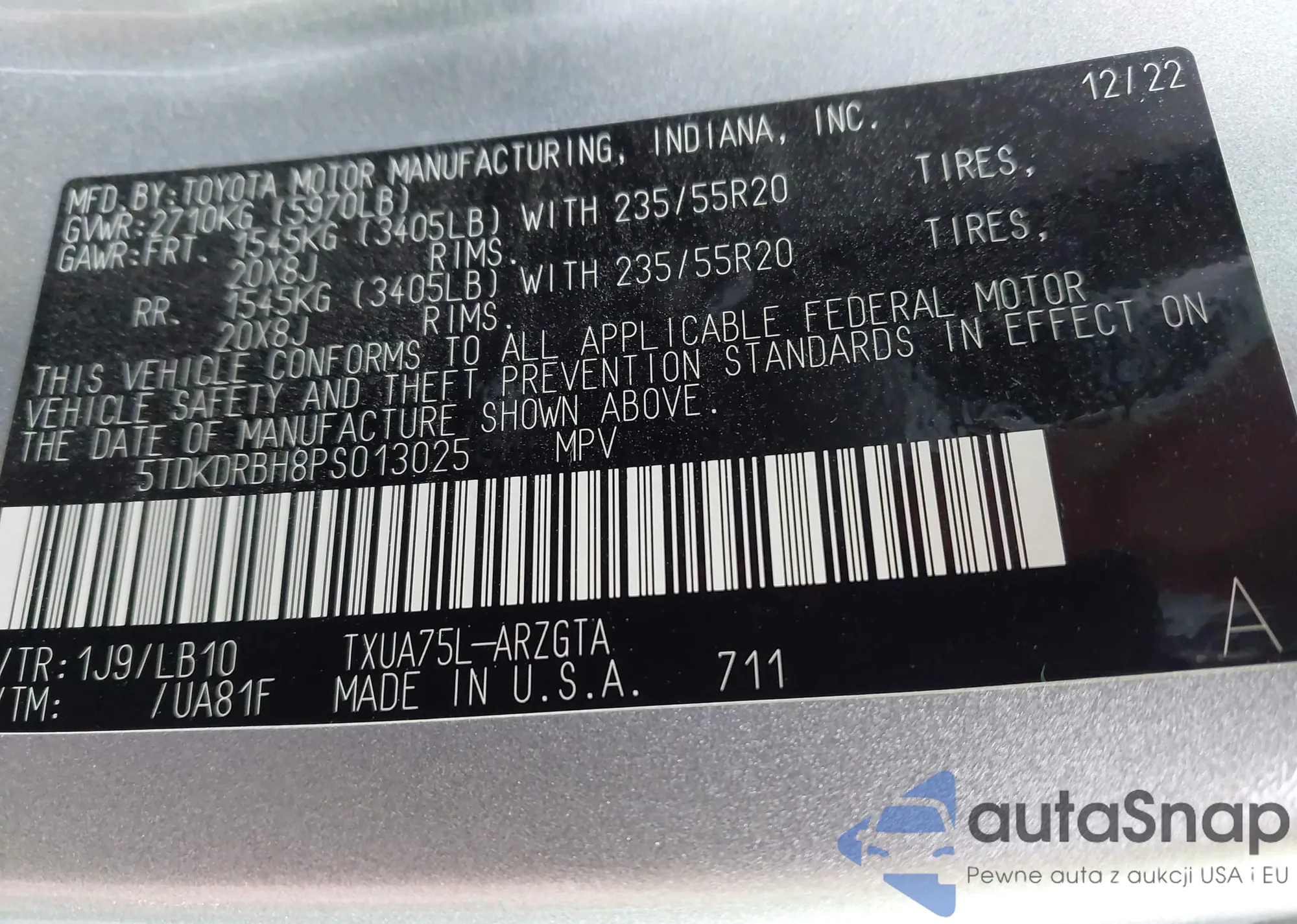 LOT: 43613069 VIN: 5TDKDRBH8PS013025