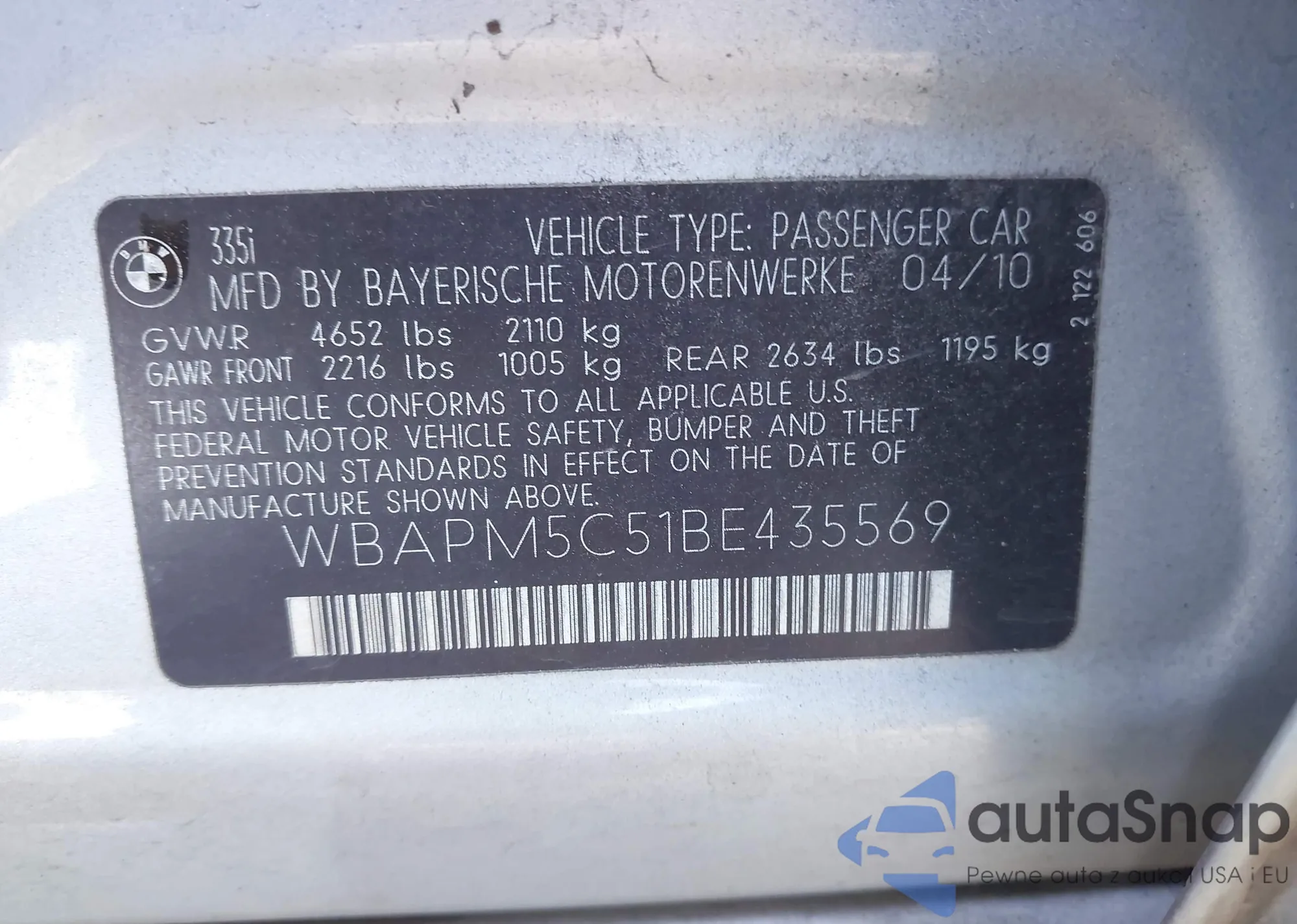 LOT: 43539066 VIN: WBAPM5C51BE435569