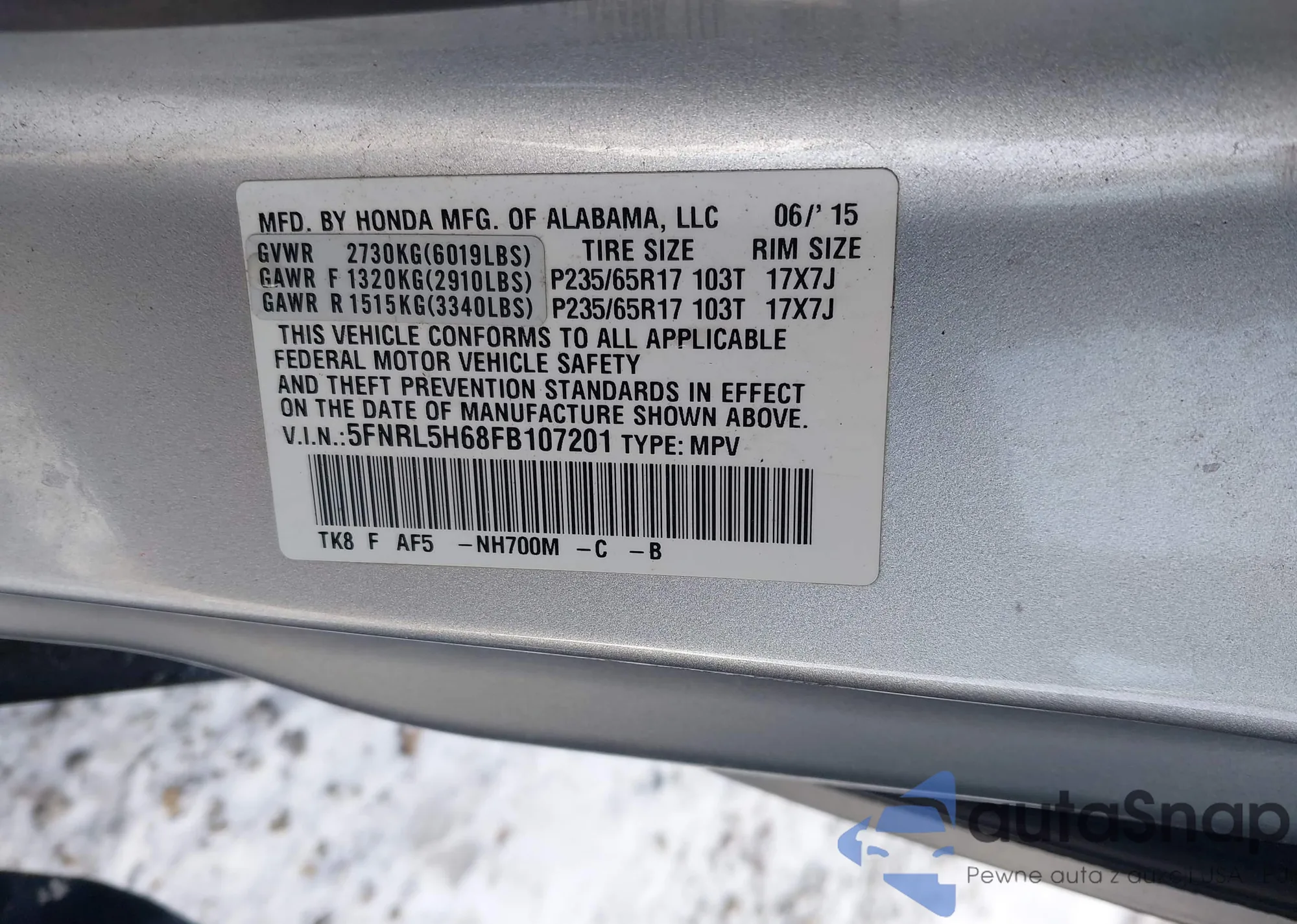 • VIN 5FNRL5H68FB107201