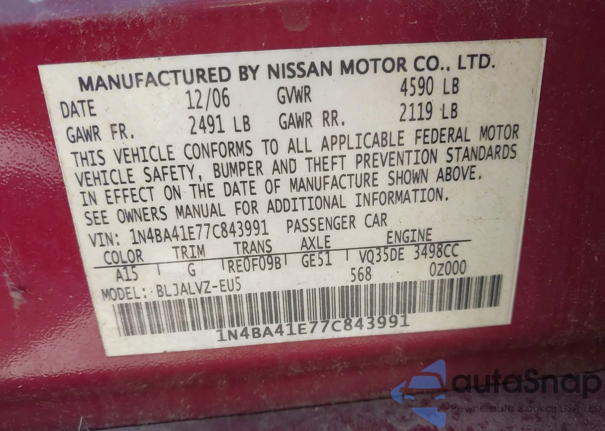LOT: 43028390 VIN: 1N4BA41E77C843991