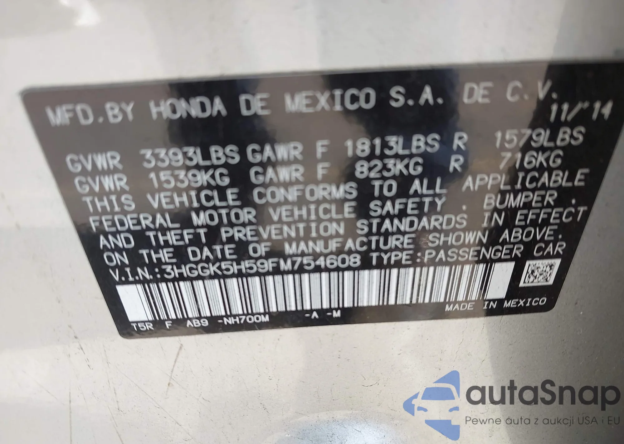 LOT: 43110428 VIN: 3HGGK5H59FM754608