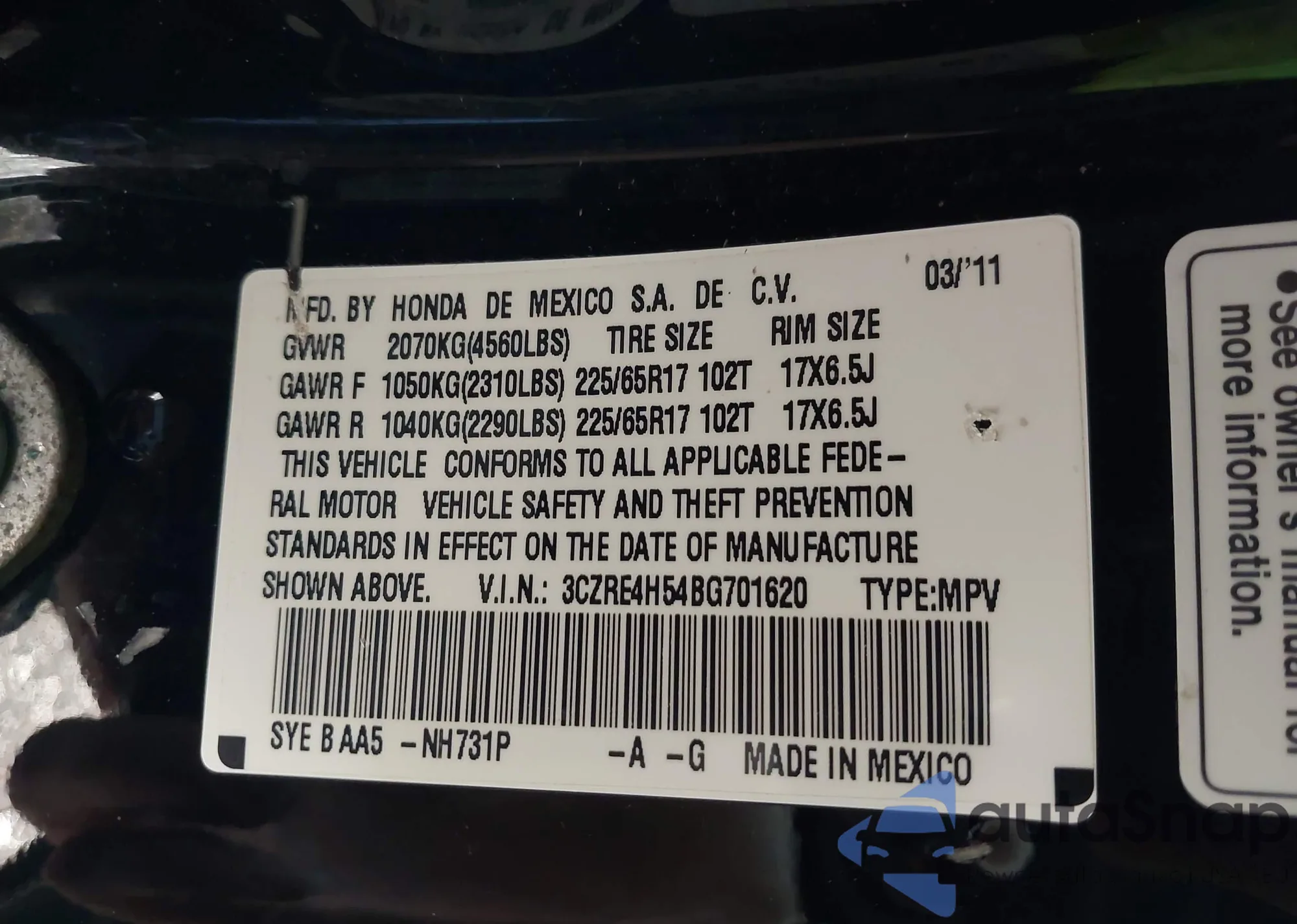 • VIN 5FNYF285X6B044031