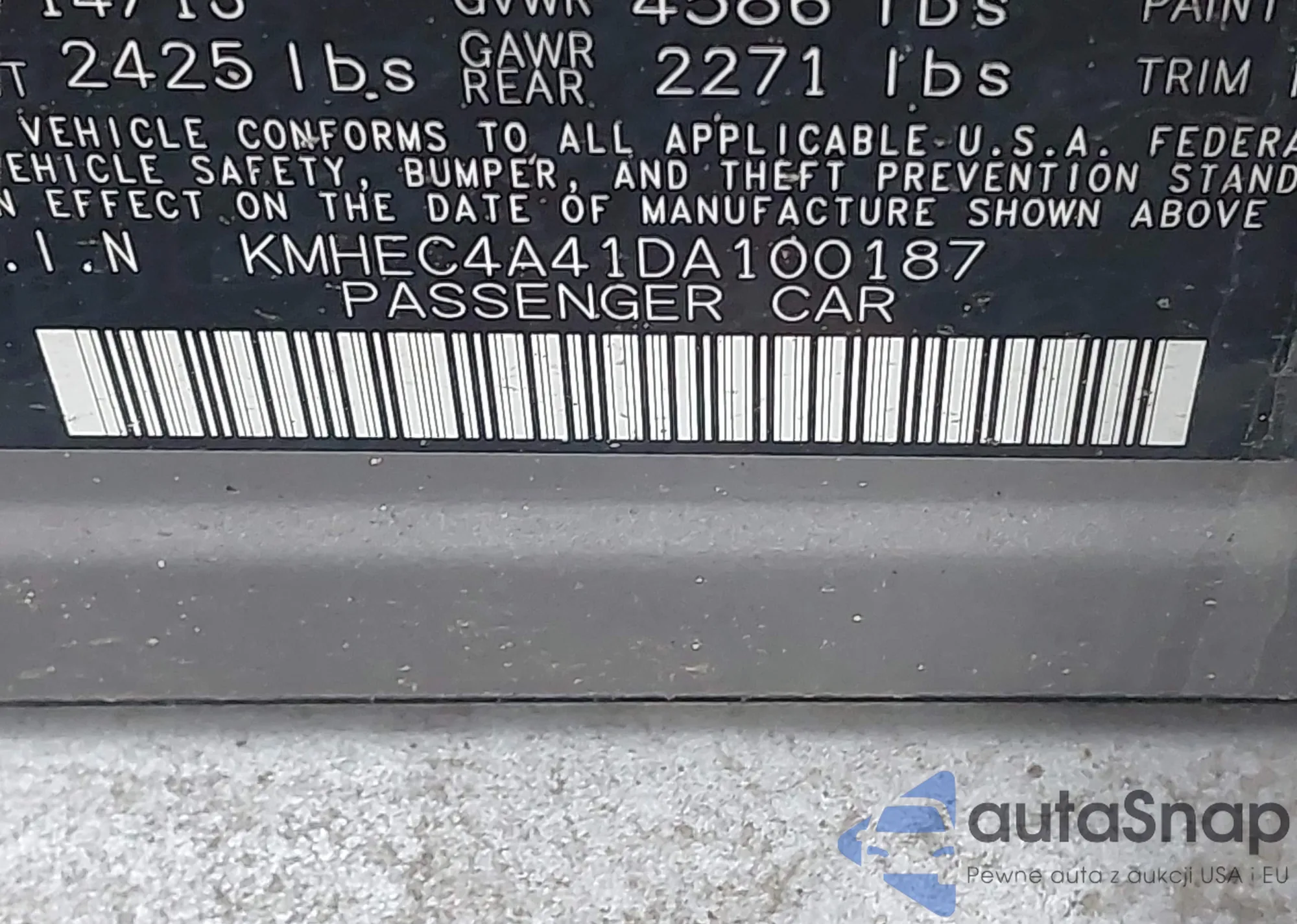 LOT: 43445141 VIN: KMHEC4A41DA100187