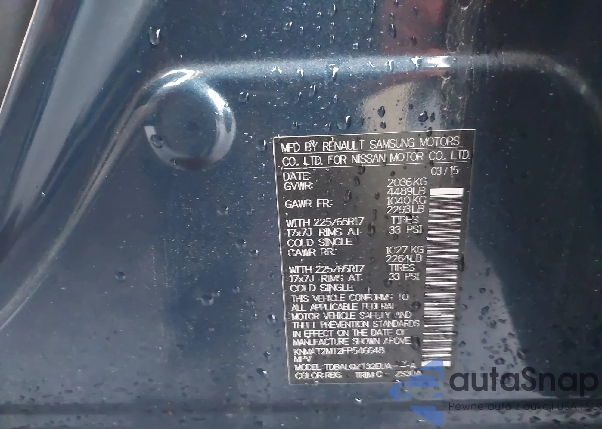 2015 Nissan Rogue Sv z USA, uszkodzony, nr VIN KNMAT2MT2FP546648