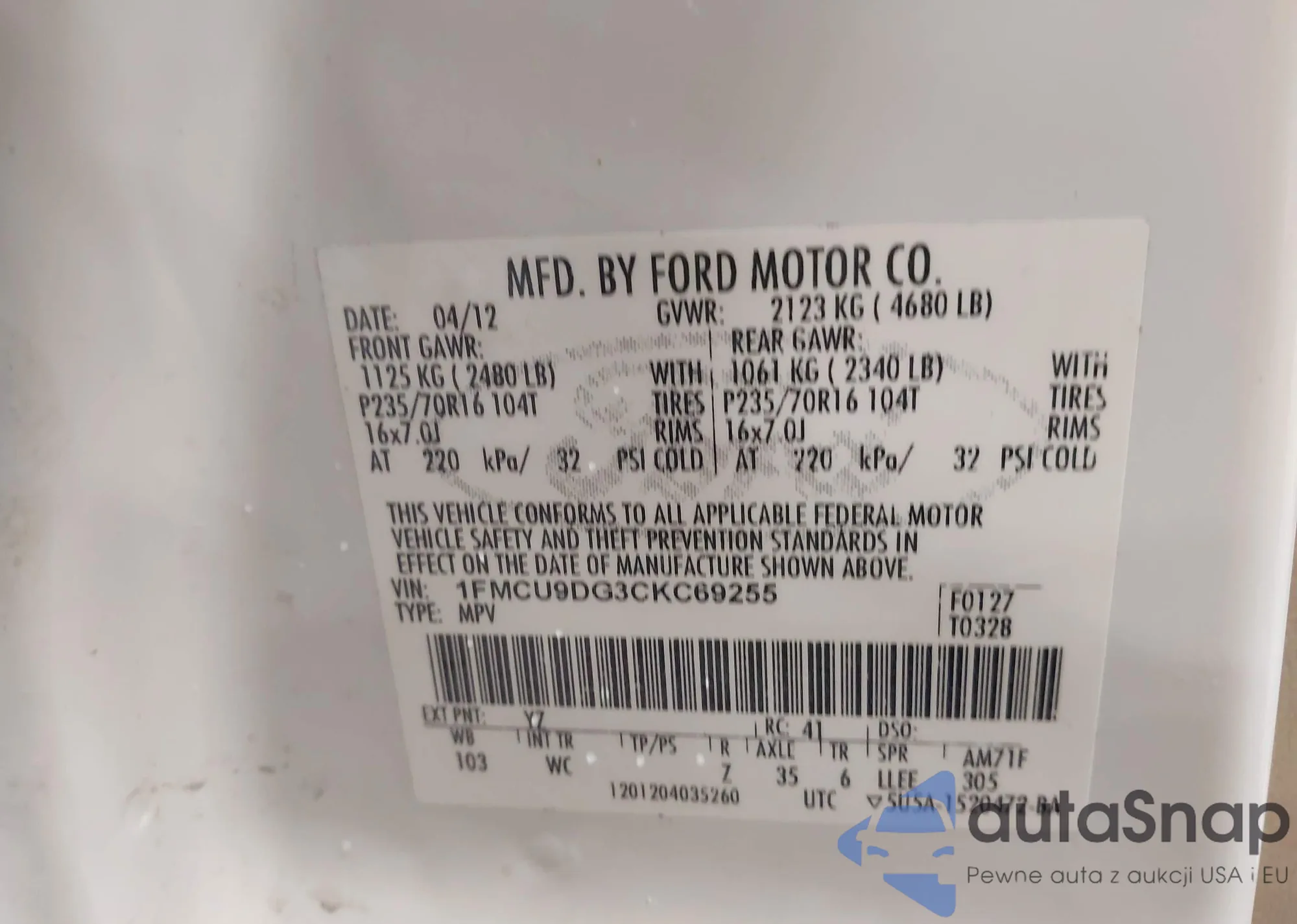 LOT: 43500000 VIN: 1FMCU9DG3CKC69255