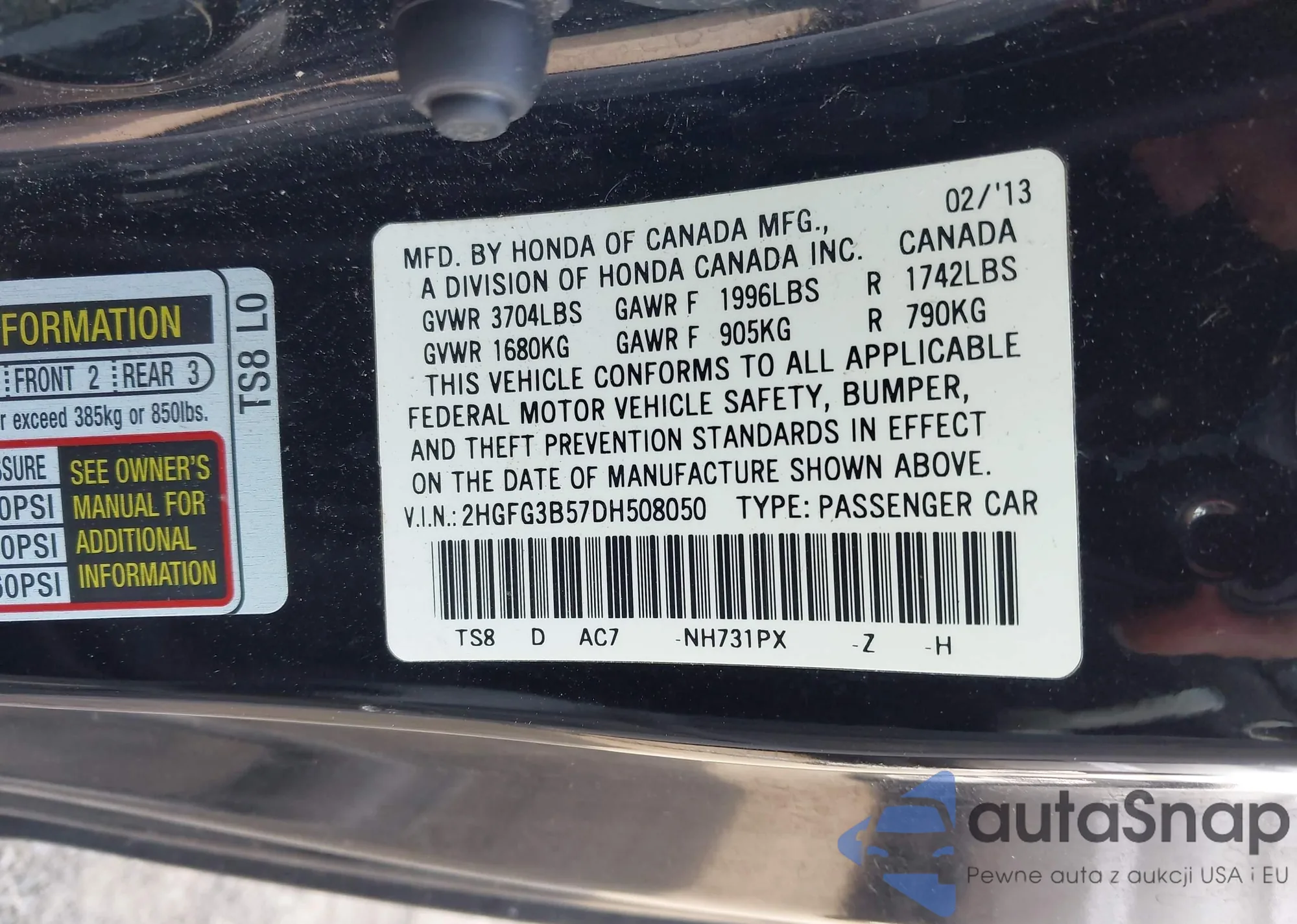 LOT: 43503203 VIN: 2HGFG3B57DH508050