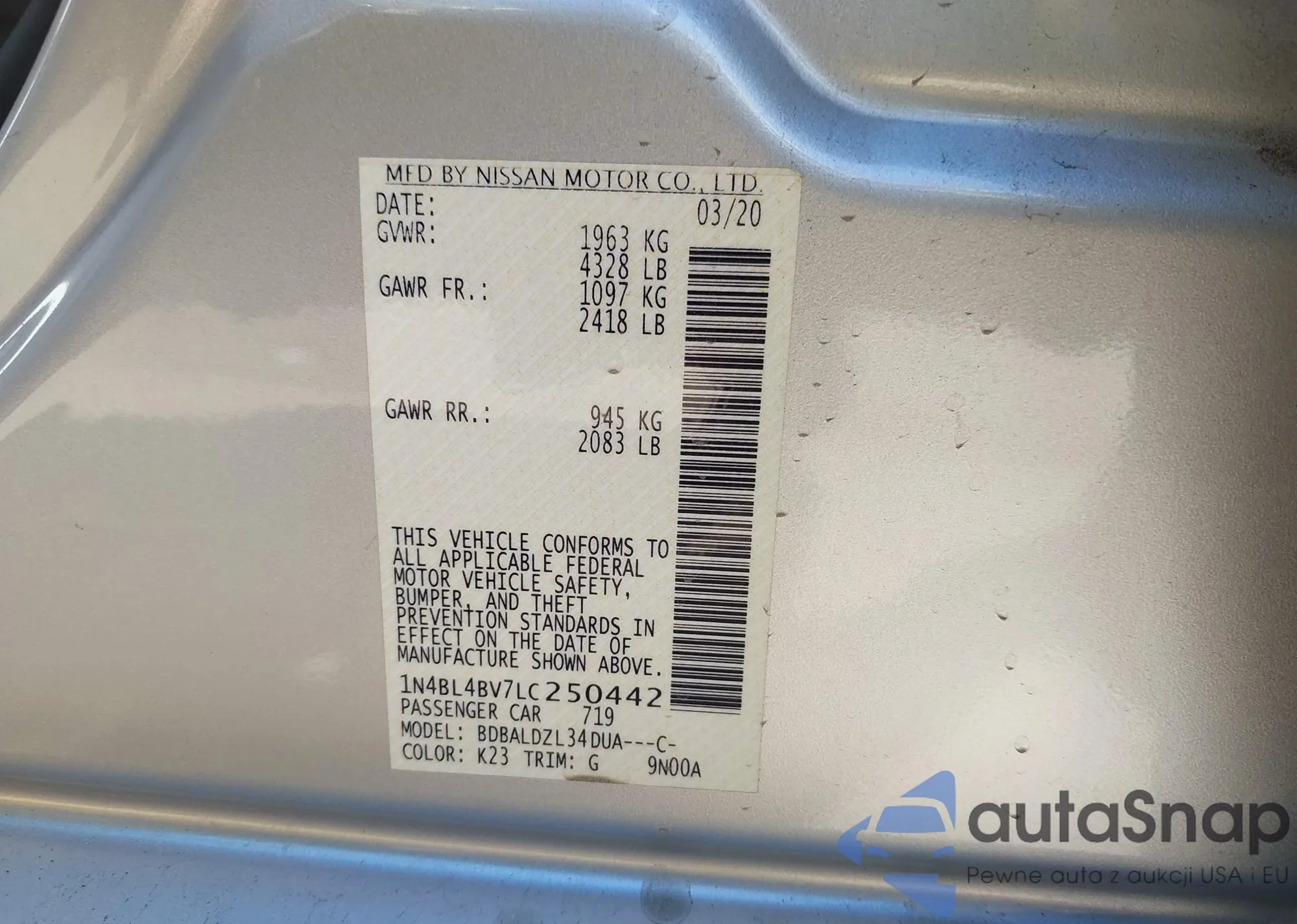 LOT: 43454777 VIN: 1N4BL4BV7LC250442