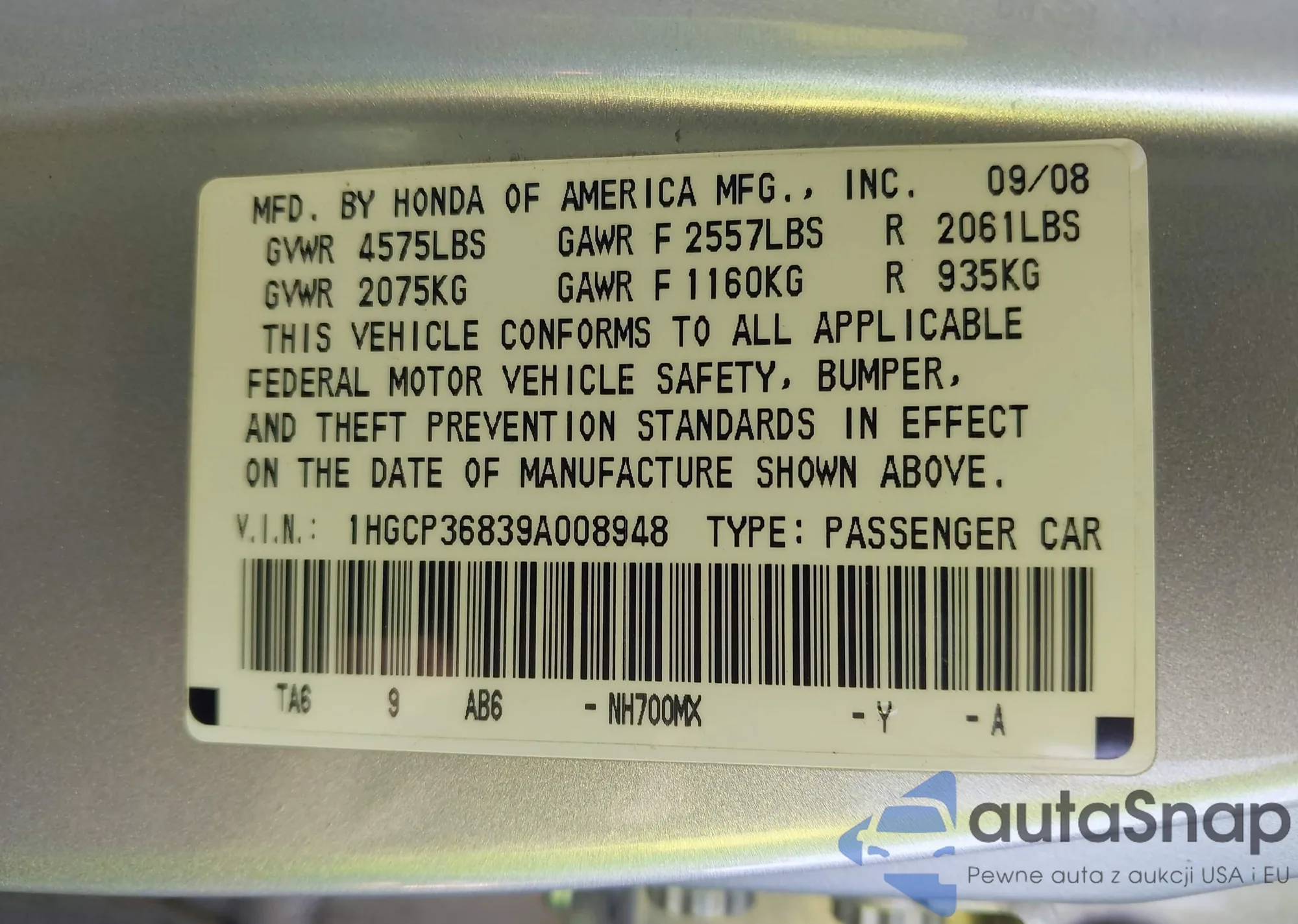 LOT: 43702475 VIN: 1HGCP36839A008948