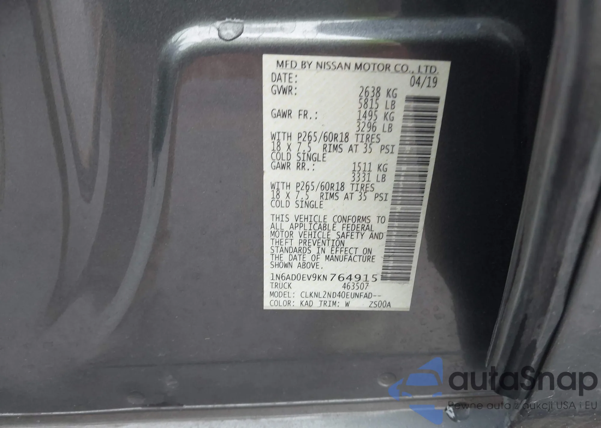 LOT: 43705883 VIN: 1N6AD0EV9KN764915
