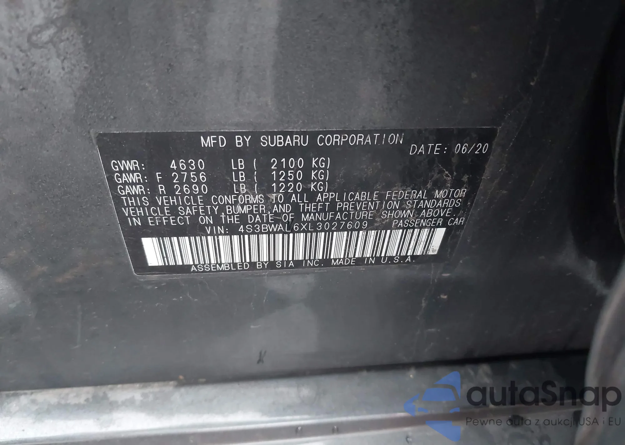• VIN 4S3BWAL6XL3027609