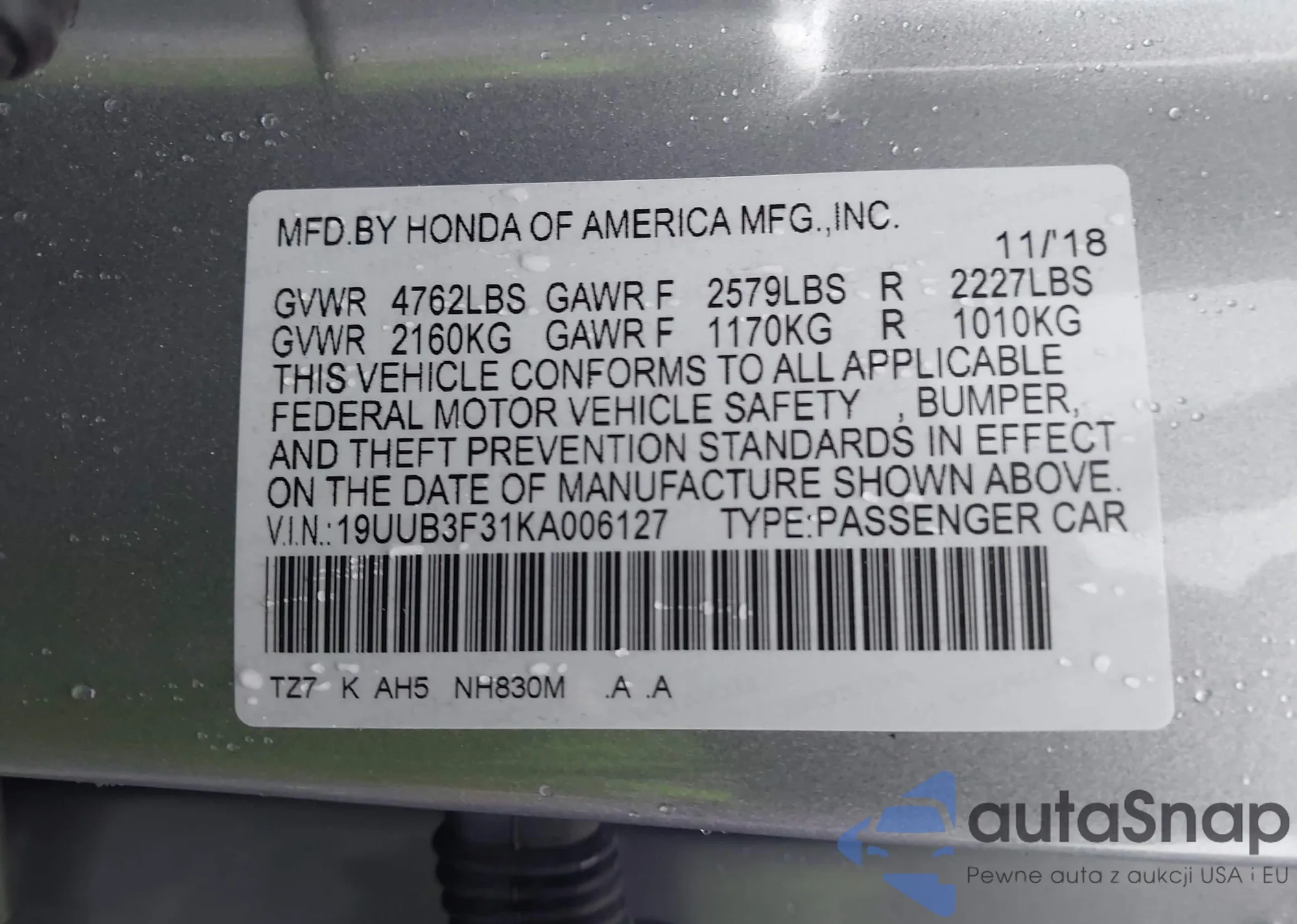 • VIN 19UUB3F31KA006127
