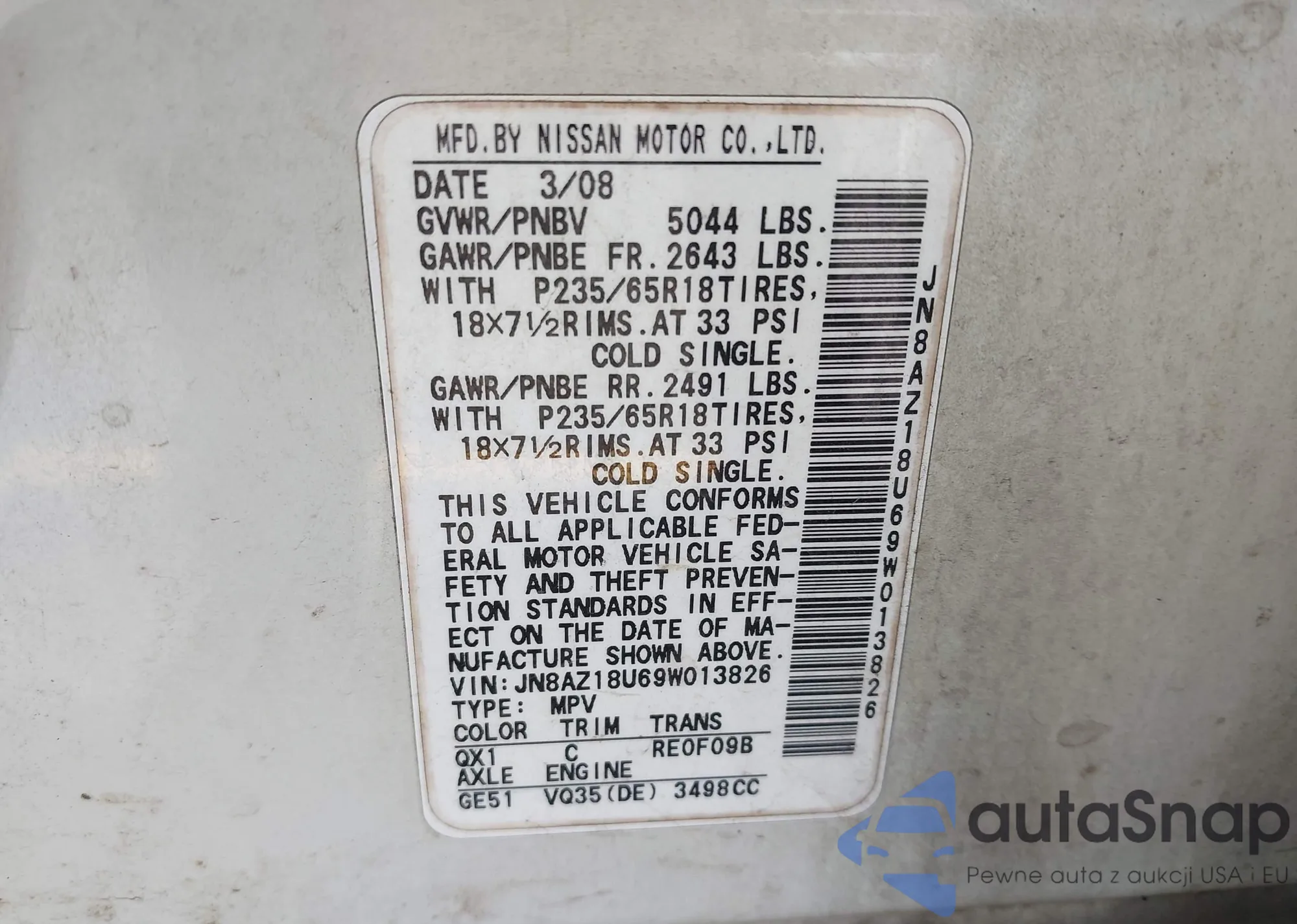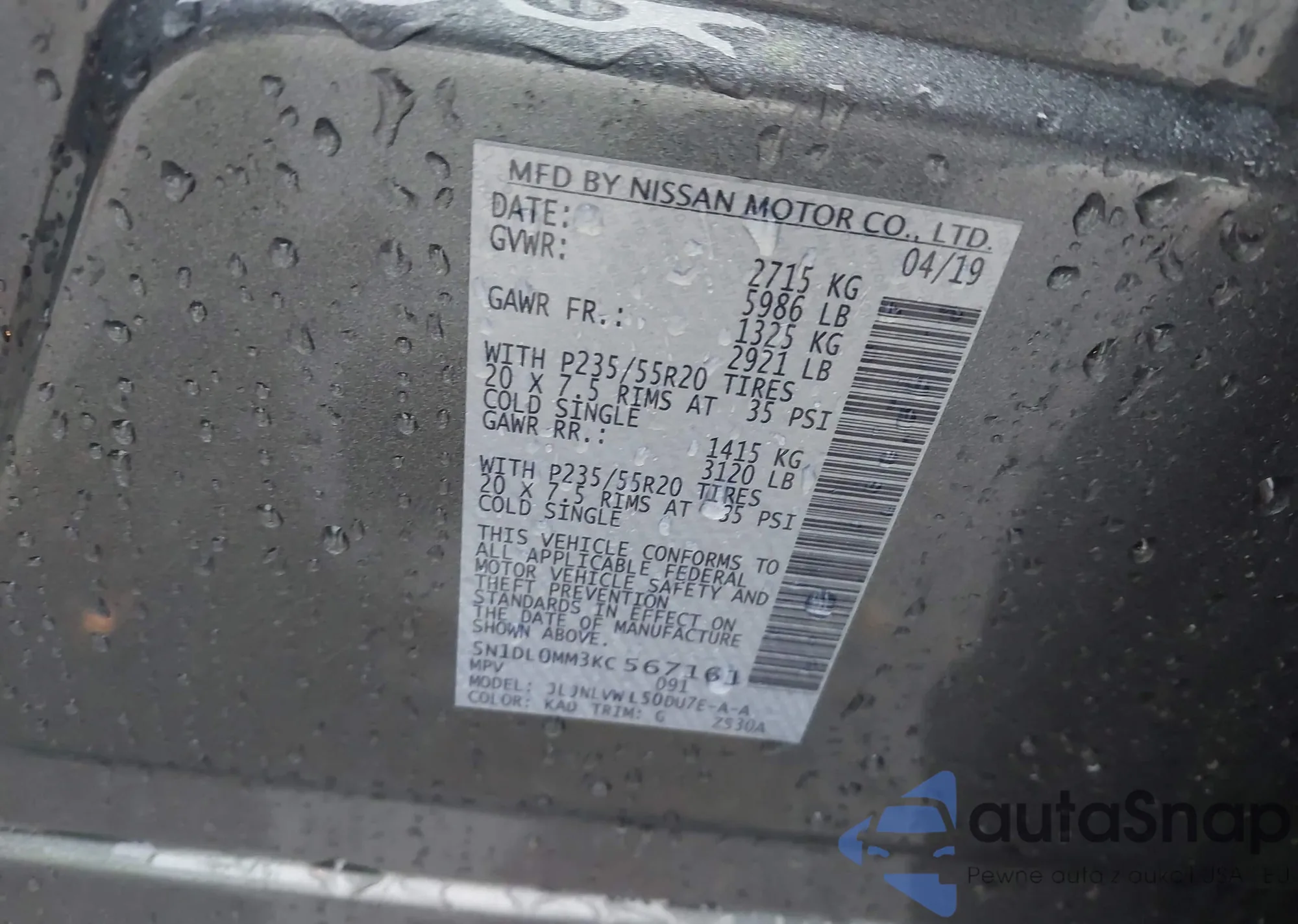 • VIN 5N1DL0MM3KC567161