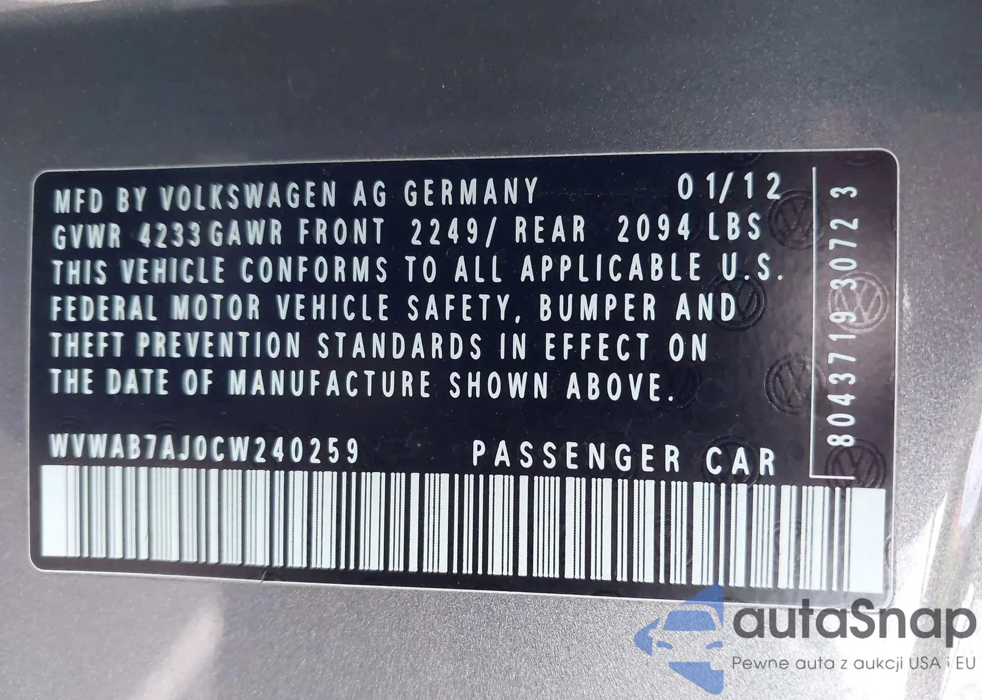 • VIN WVWAB7AJ0CW240259
