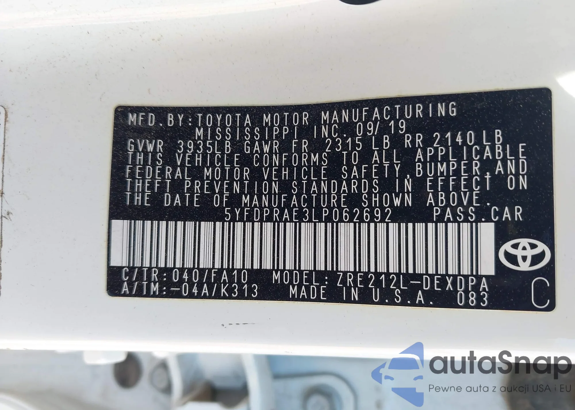 • VIN 5YFDPRAE3LP062692