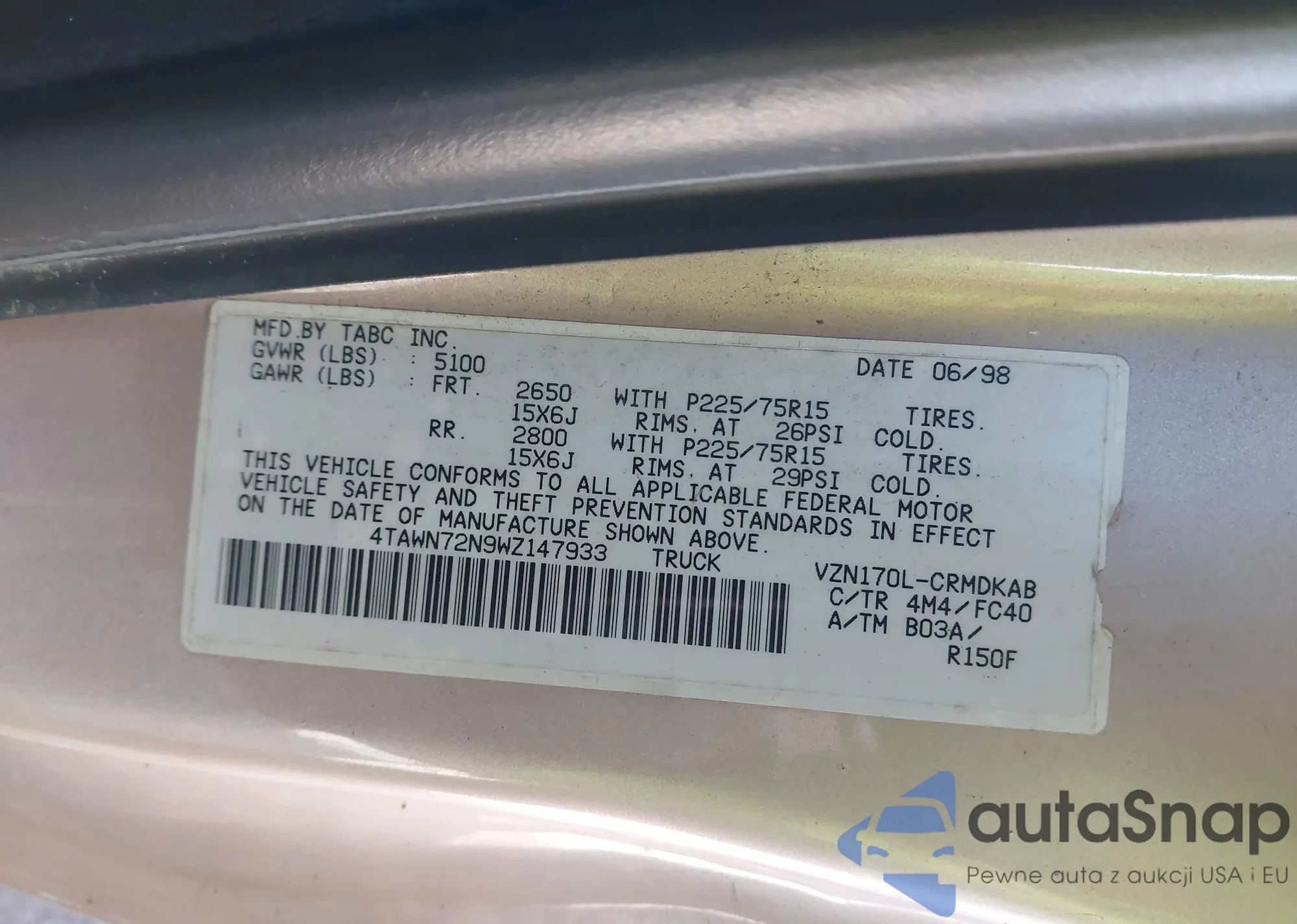 • VIN 4TAWN72N9WZ147933