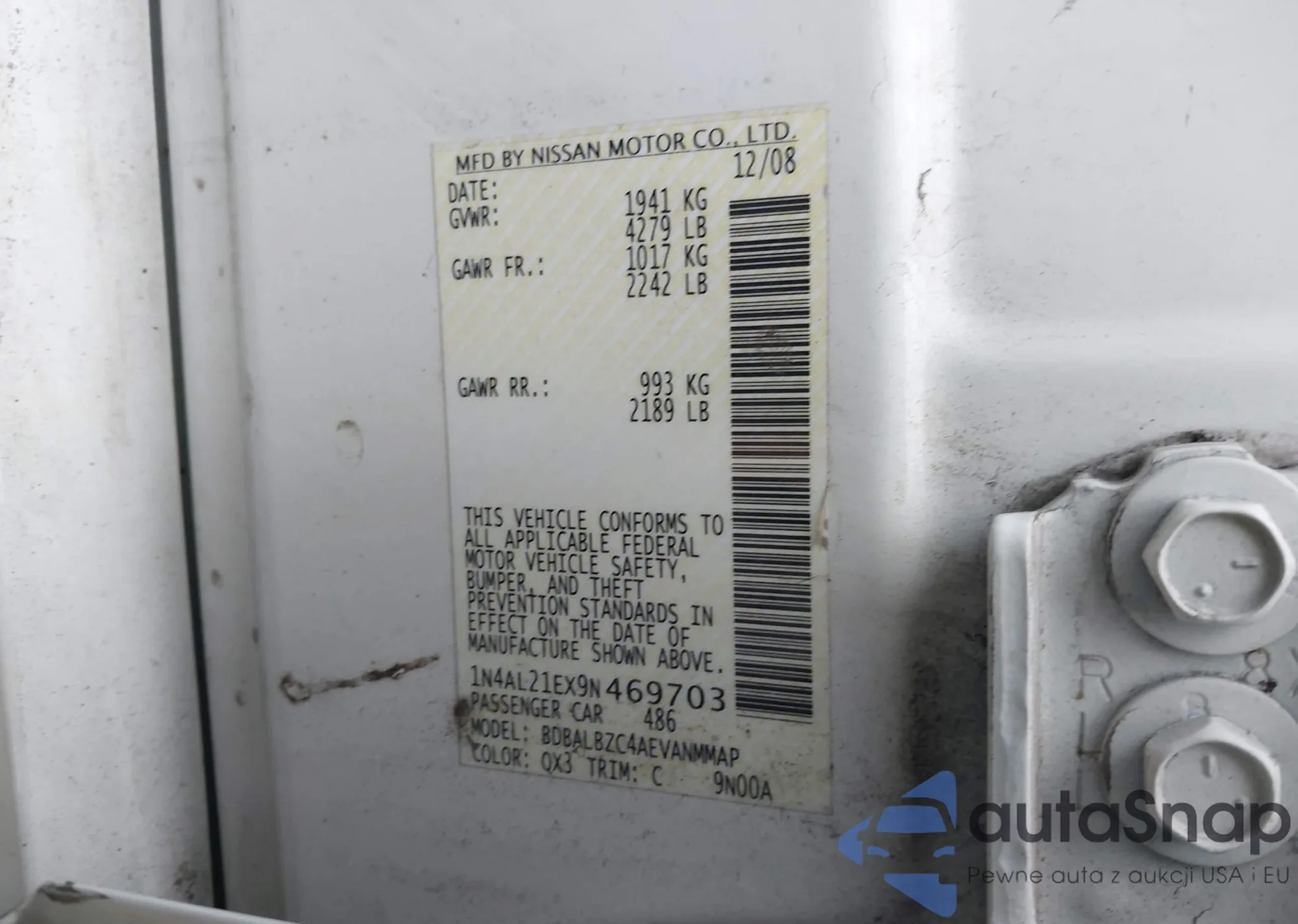 2009 Nissan Altima 2.5 S z USA, uszkodzony, nr VIN 1N4AL21EX9N469703