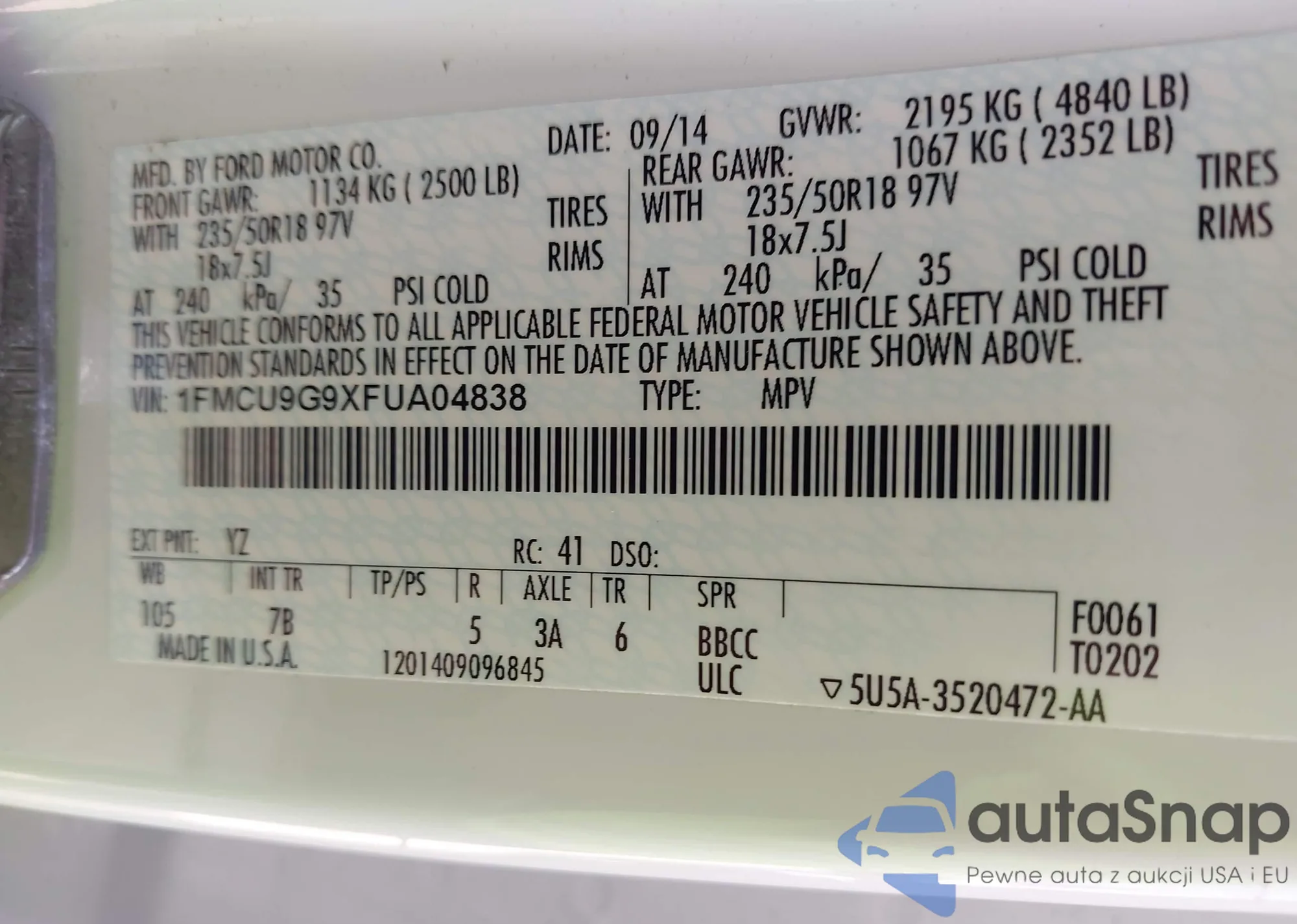 • VIN 1FMCU9G9XFUA04838
