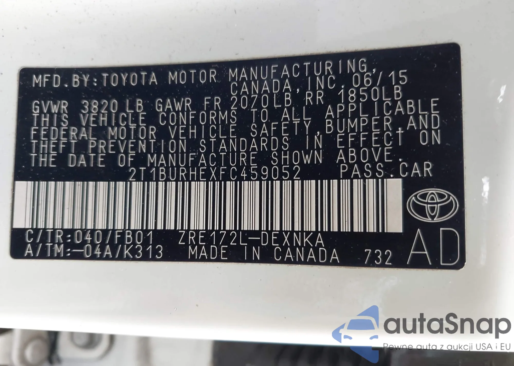 • VIN 2T1BURHEXFC459052