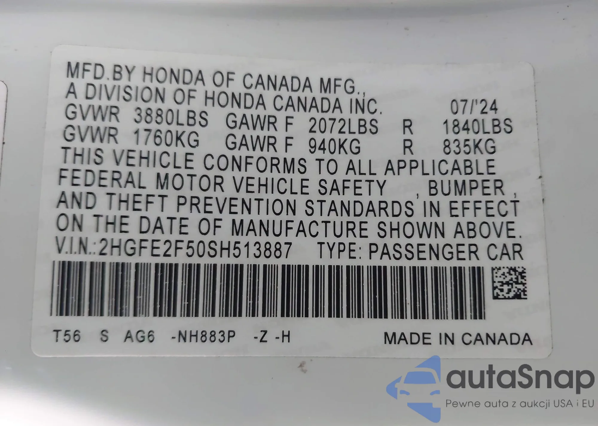 LOT: 43548395 VIN: 2HGFE2F50SH513887