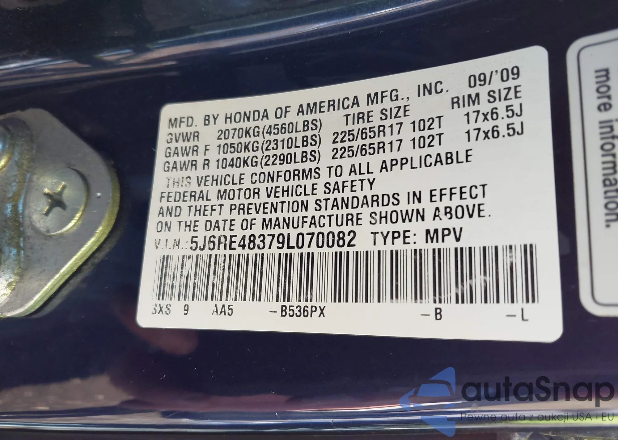 • VIN 5J6RE48379L070082