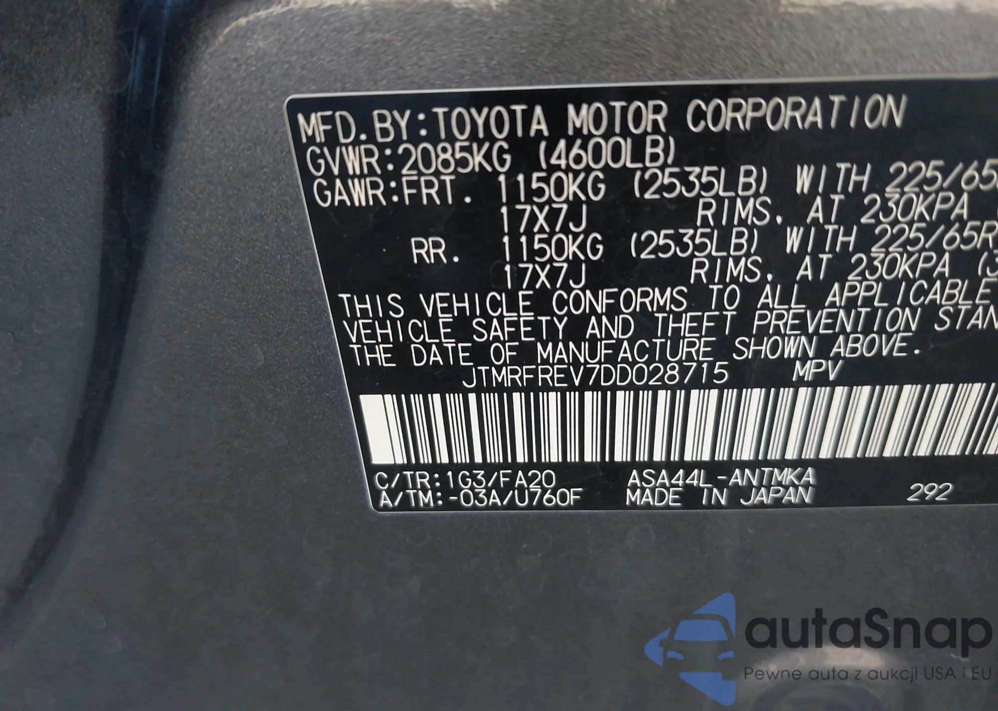LOT: 43313179 VIN: JTMRFREV7DD028715