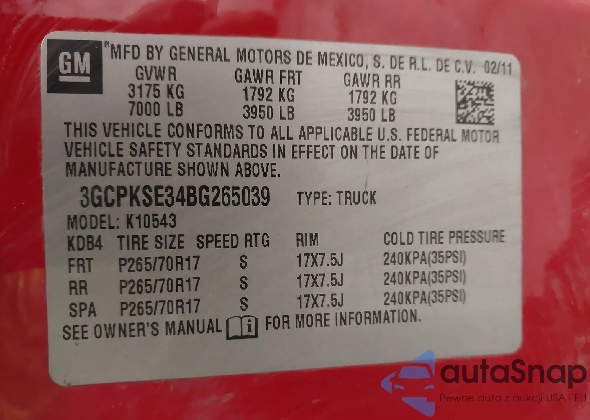 • VIN 3GCPKSE34BG265039