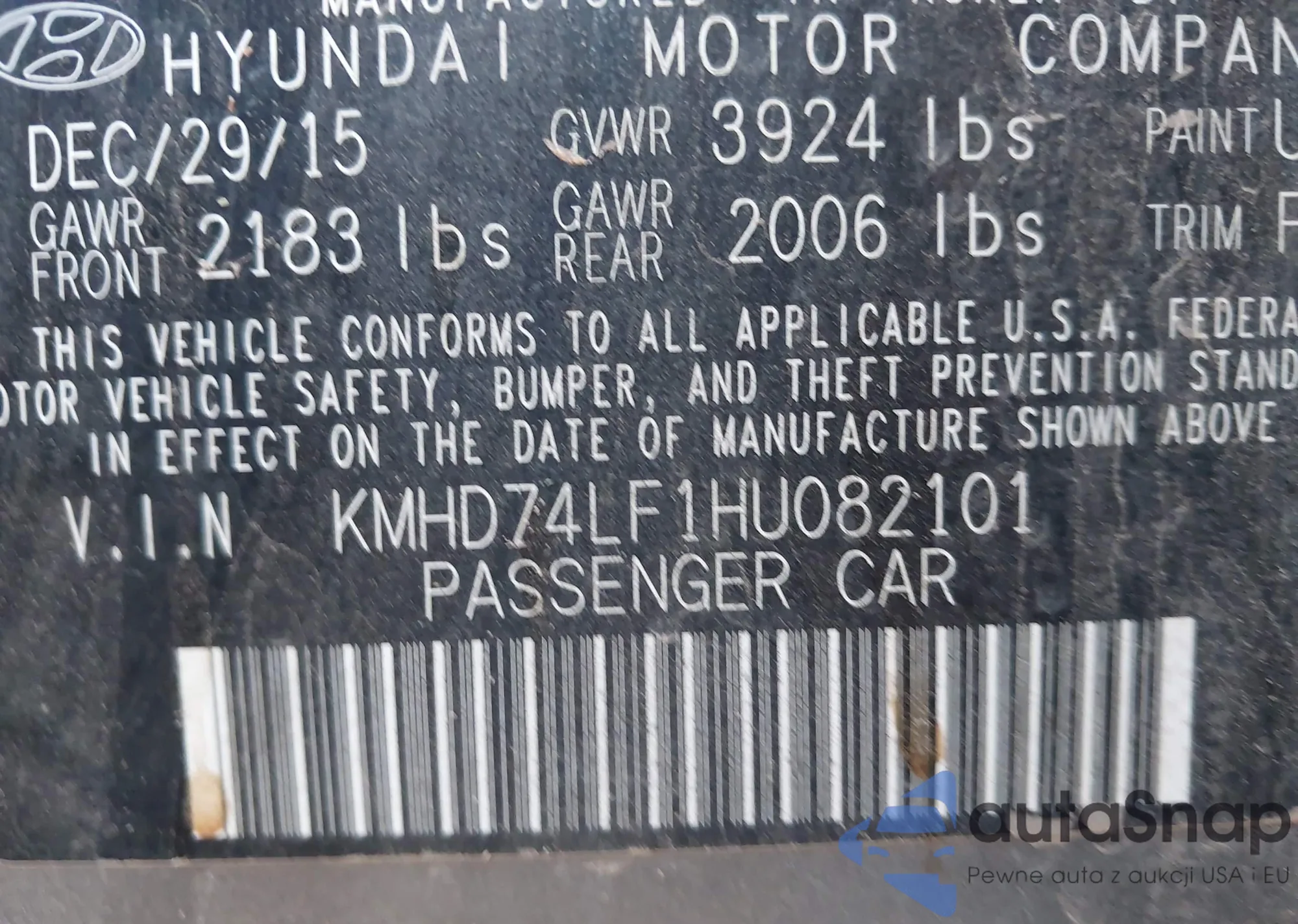 LOT: 43327509 VIN: KMHD74LF1HU082101