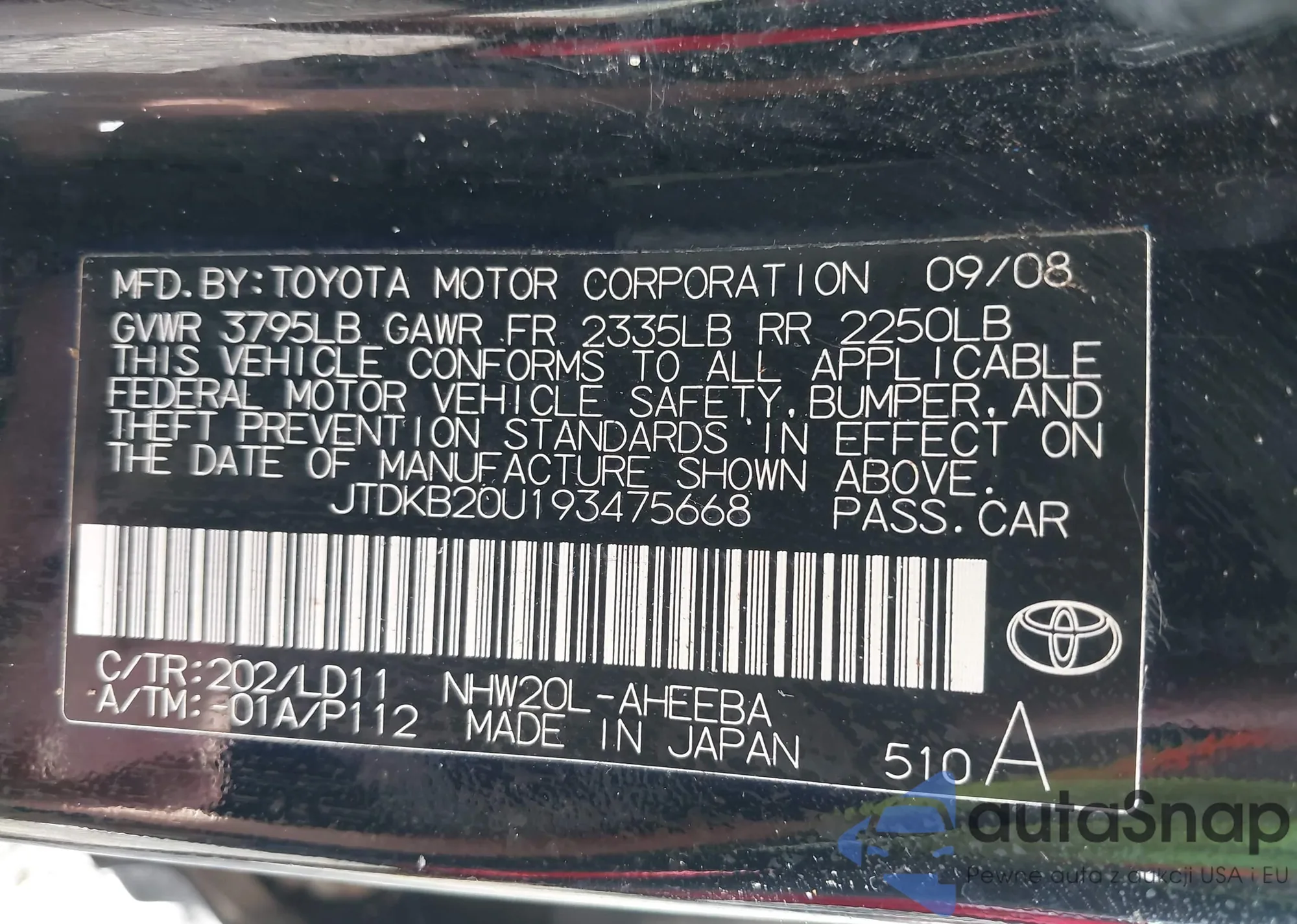 LOT: 43345296 VIN: JTDKB20U193475668