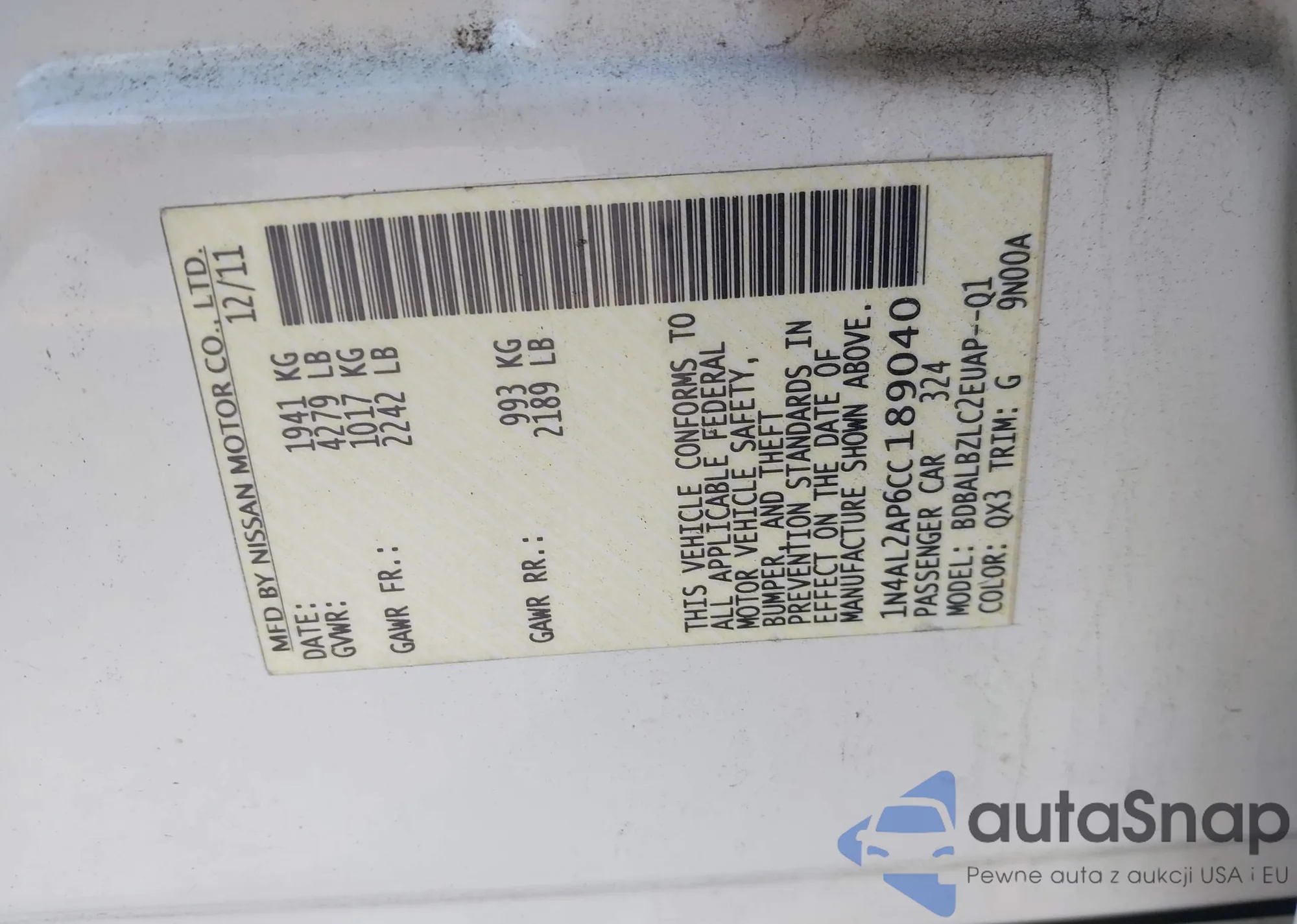 • VIN 1HGCP2F64CA013379