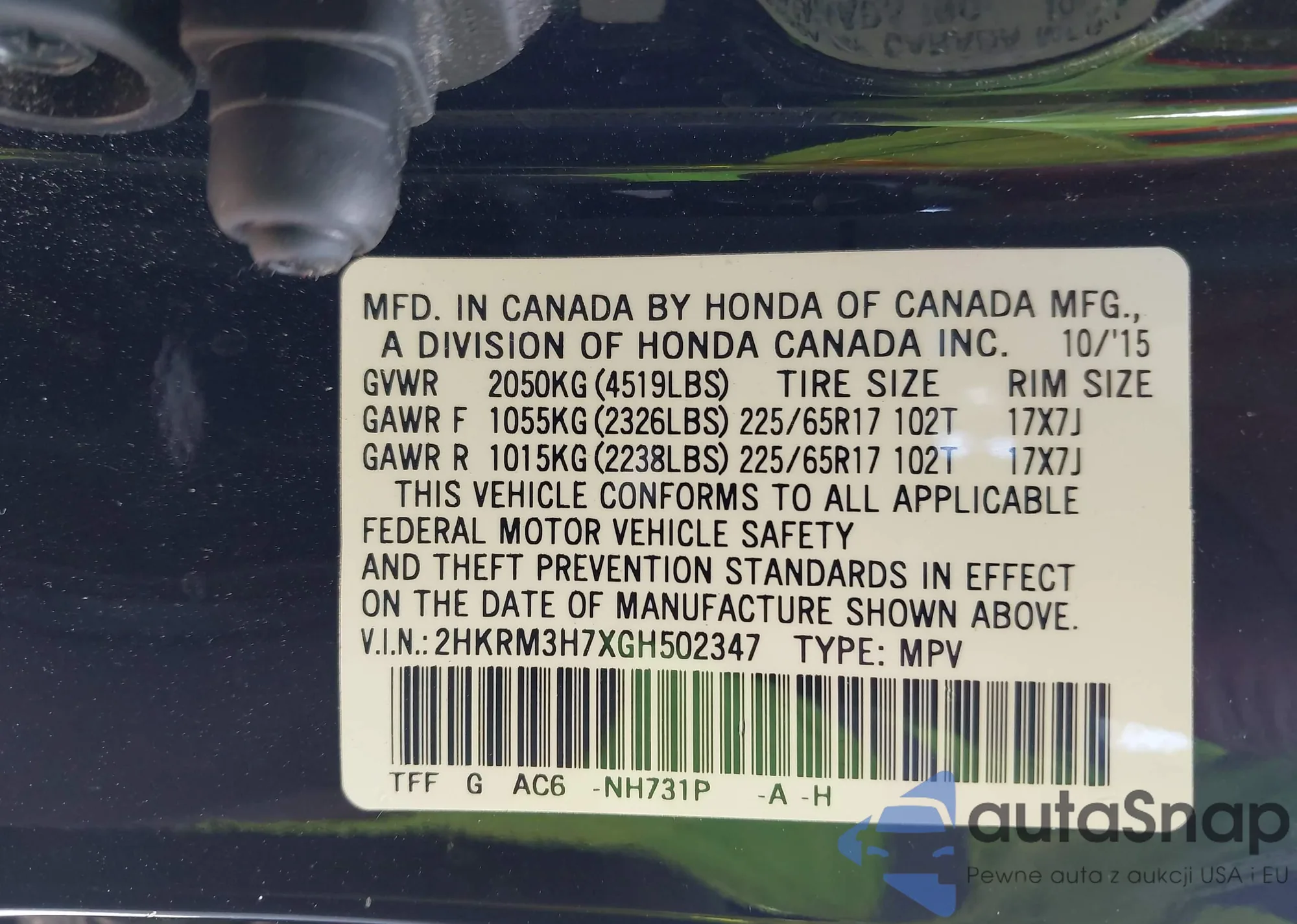 • VIN 2HKRM3H7XGH502347