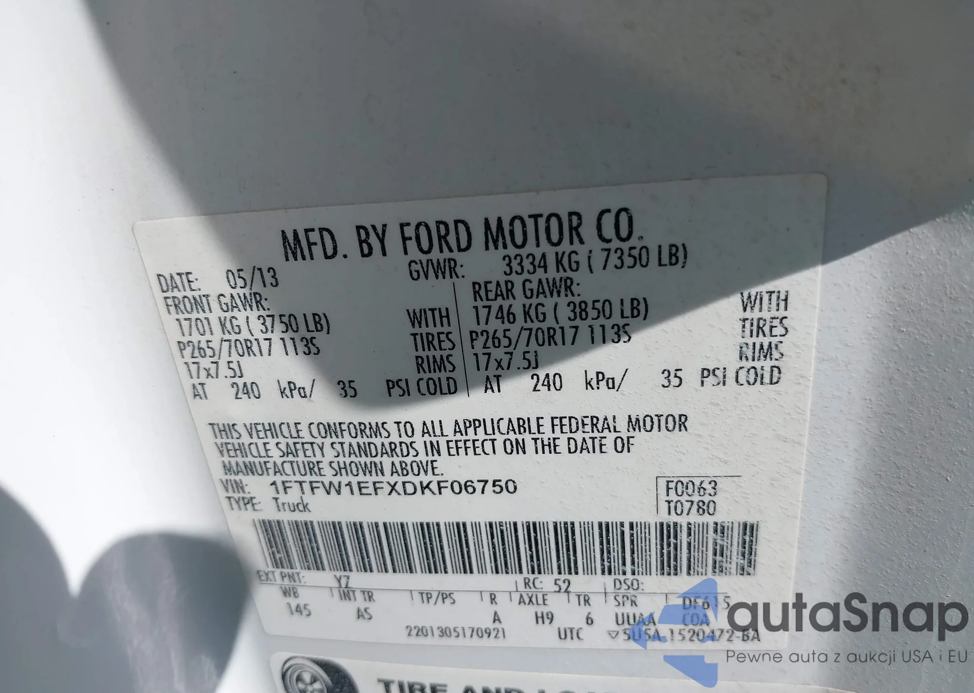 LOT: 43044097 VIN: 1FTFW1EFXDKF06750