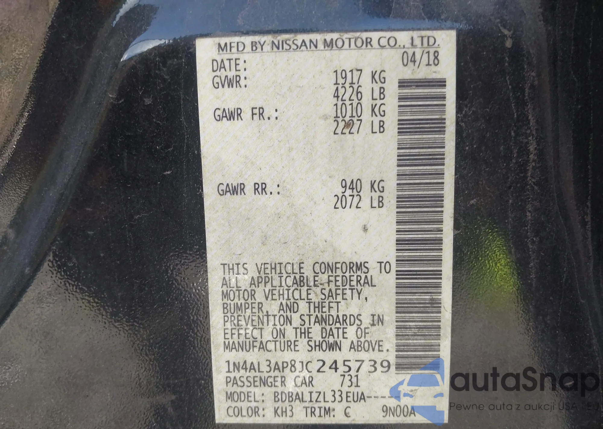 LOT: 43410778 VIN: 1N4AL3AP8JC245739