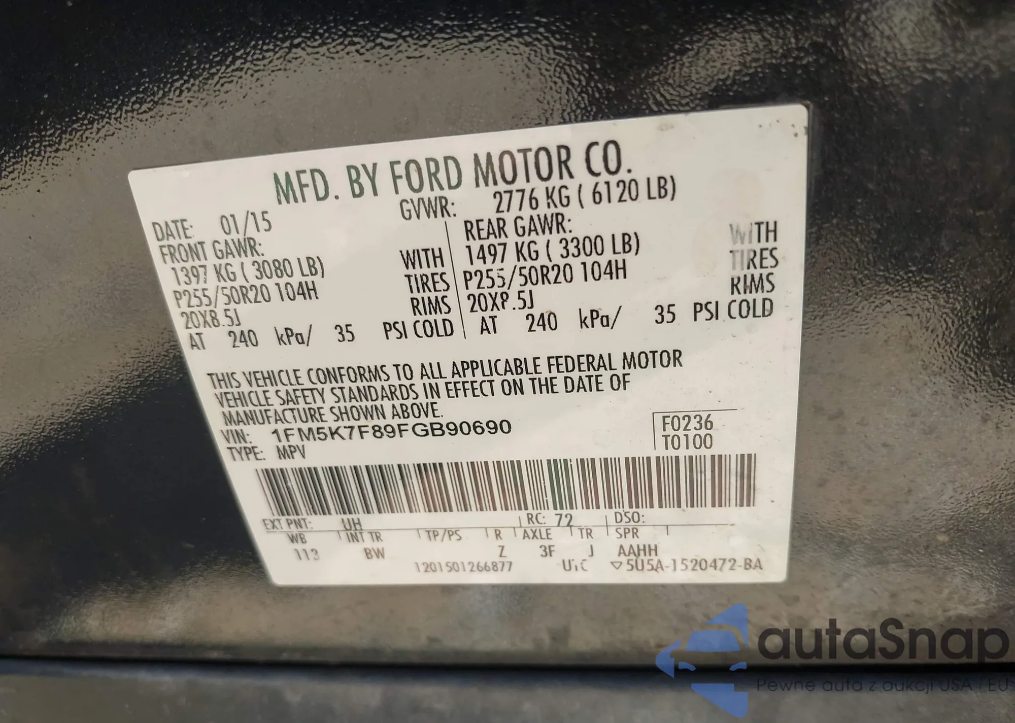LOT: 42804862 VIN: 1FM5K7F89FGB90690