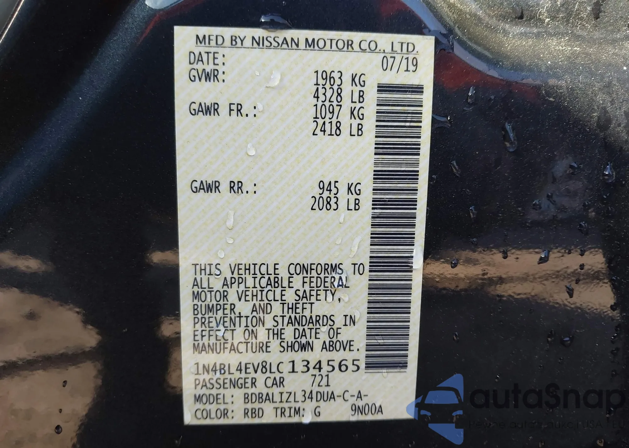 • VIN 1N4BL4EV8LC134565