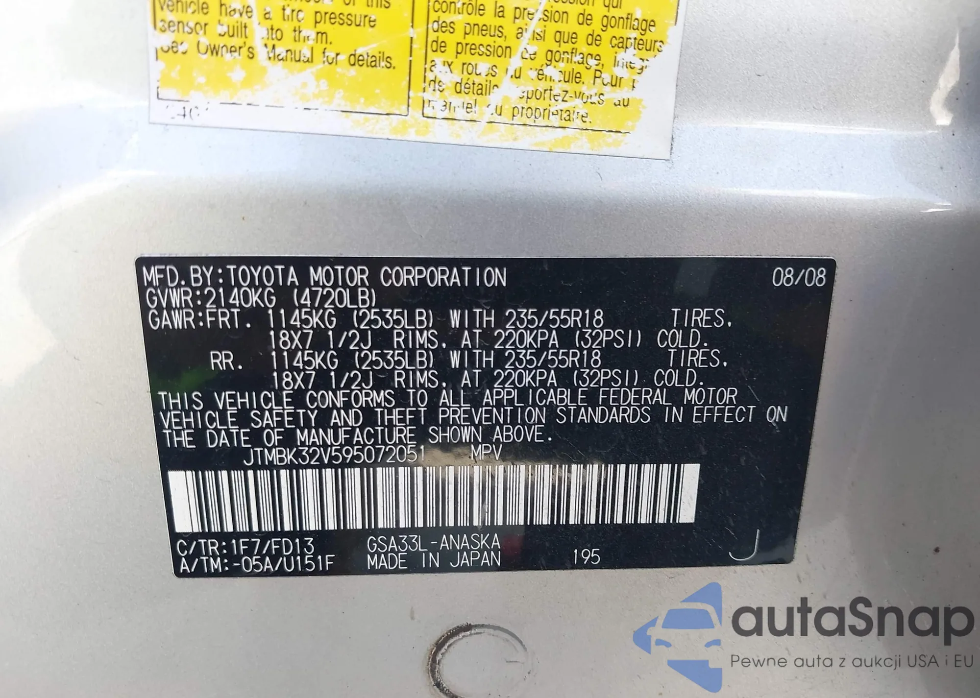LOT: 43479407 VIN: JTMBK32V595072051