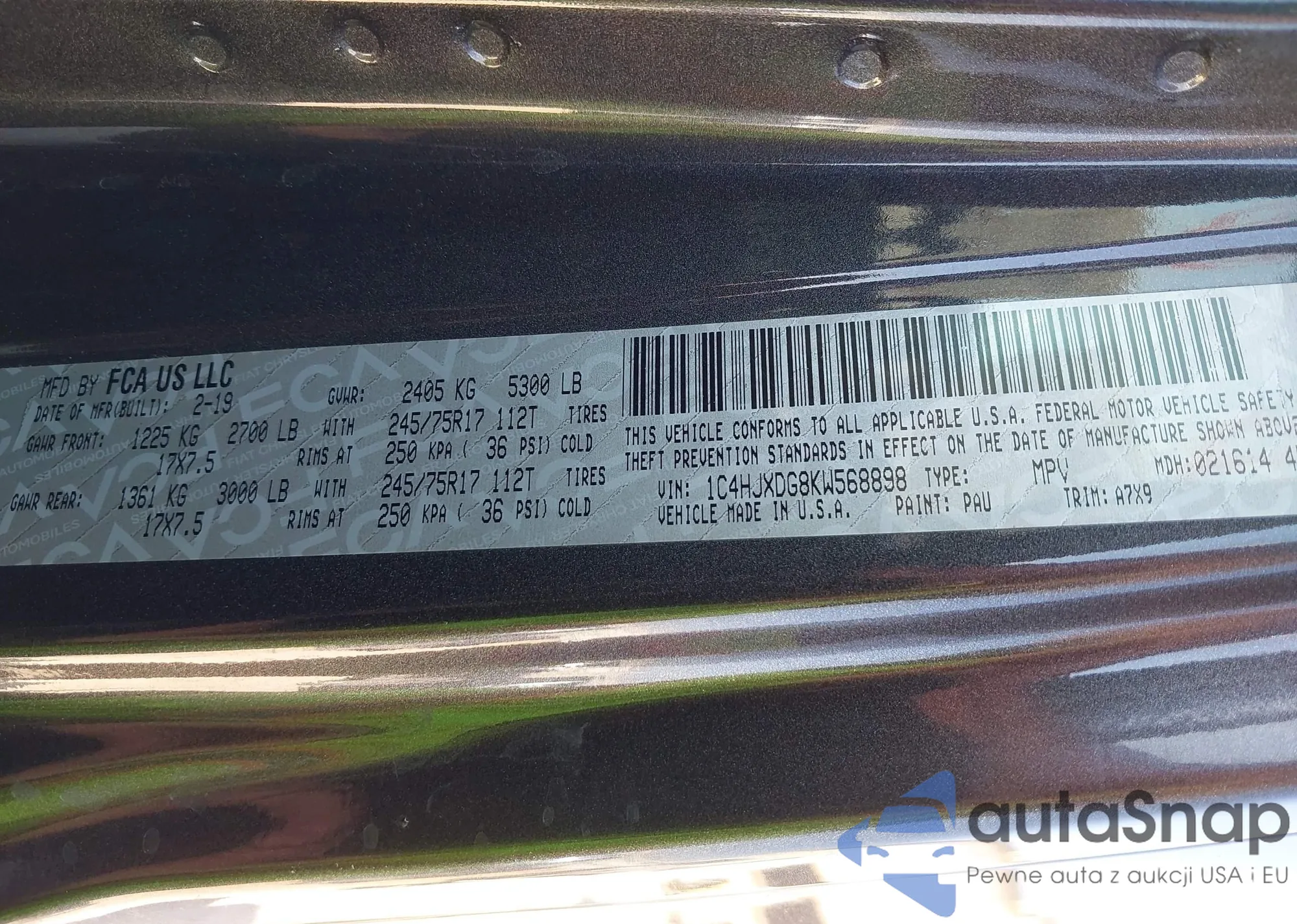 LOT: 43459204 VIN: 1C4HJXDG8KW568898