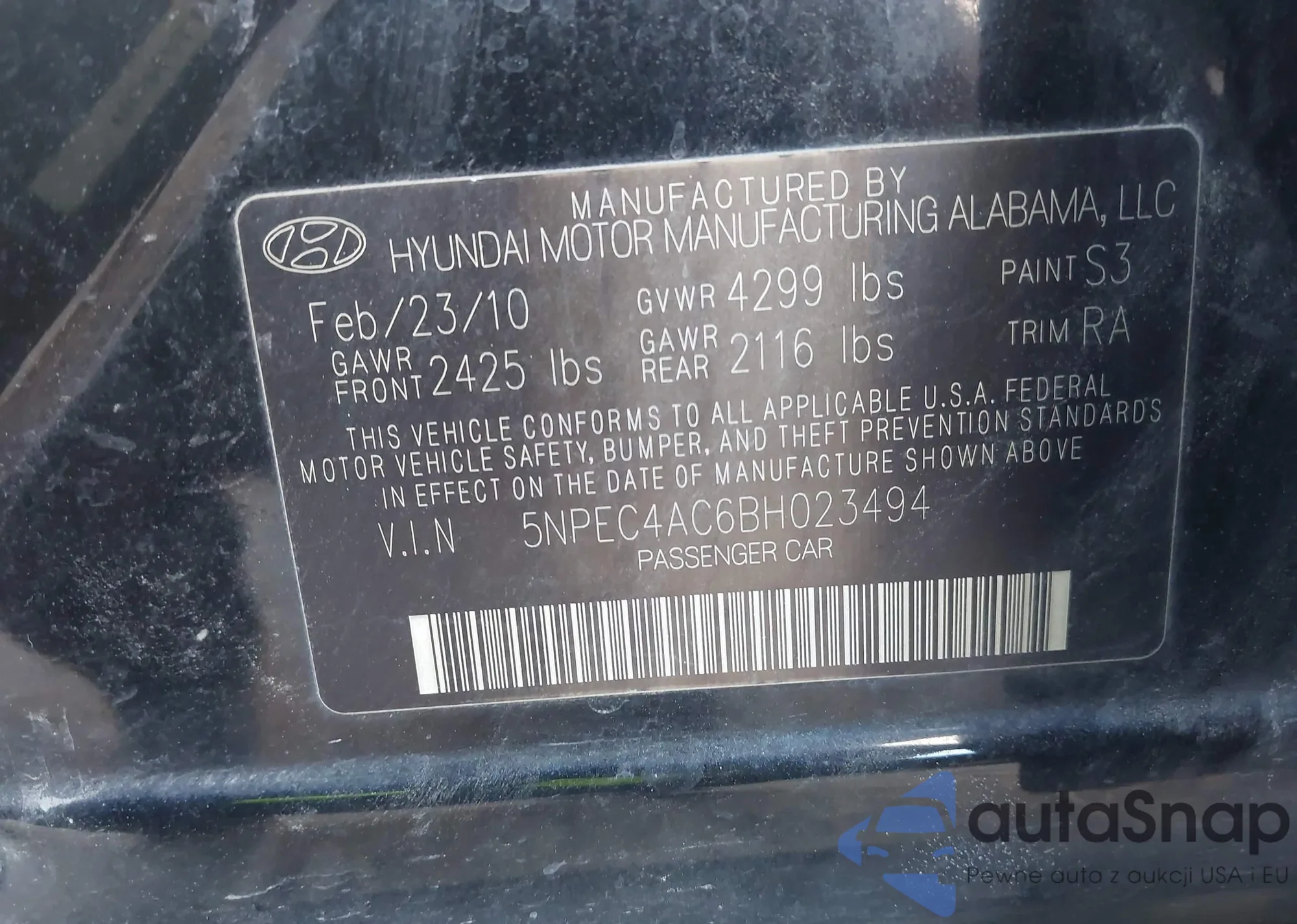 • VIN 5NPEB4AC2BH277299