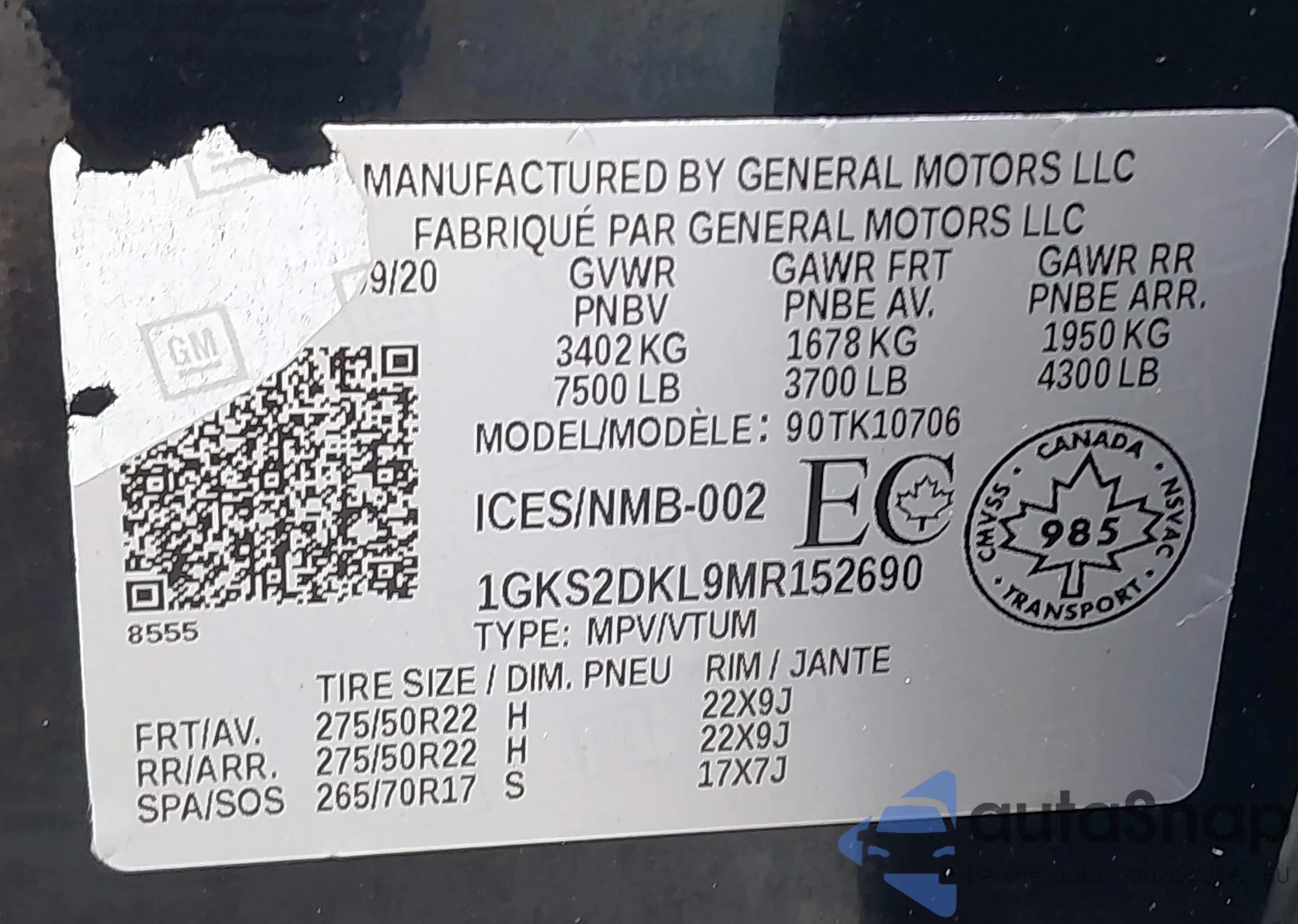 LOT: 43856356 VIN: 1GKS2DKL9MR152690