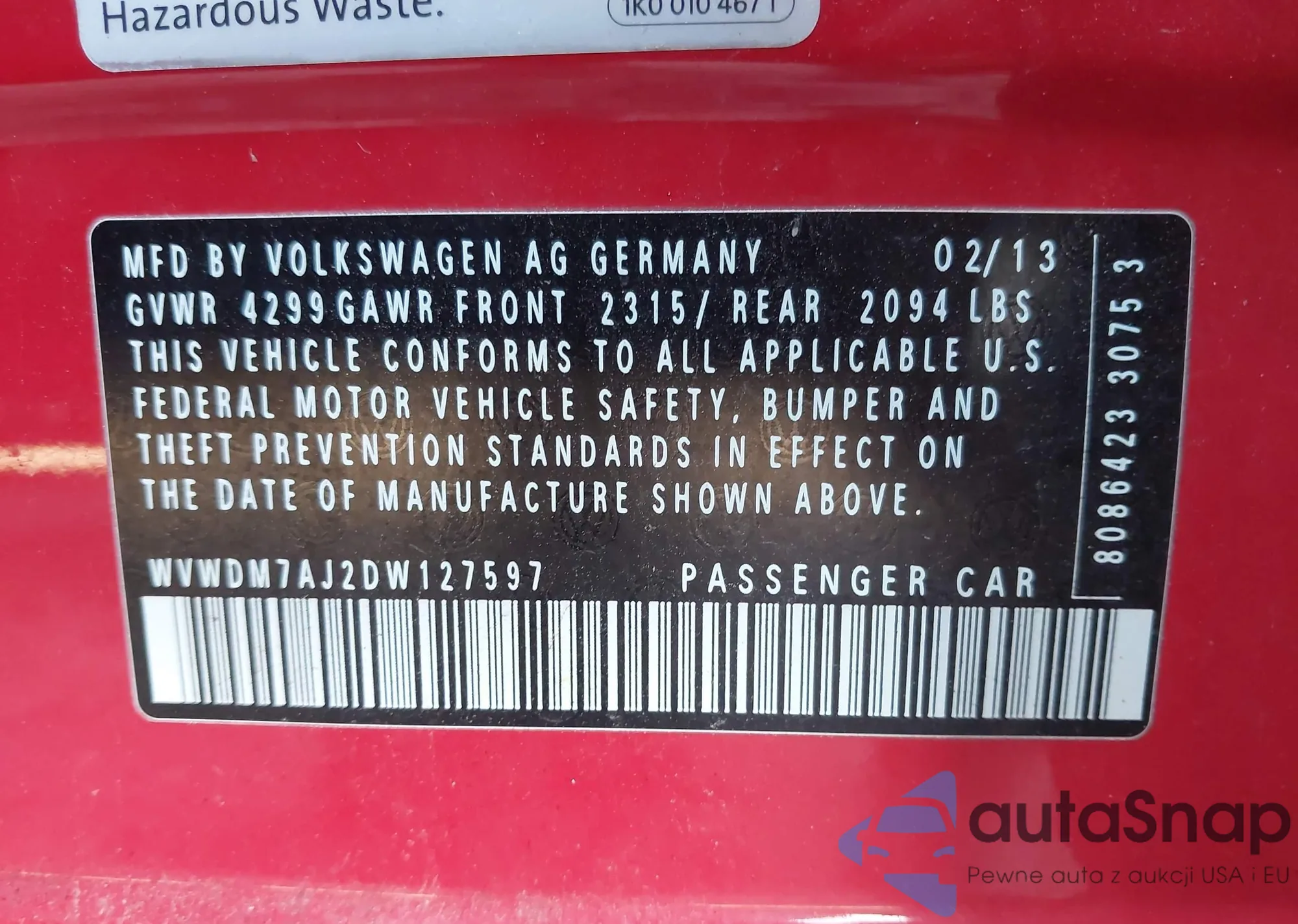 LOT: 43510195 VIN: 2HGFG3B55DH522464