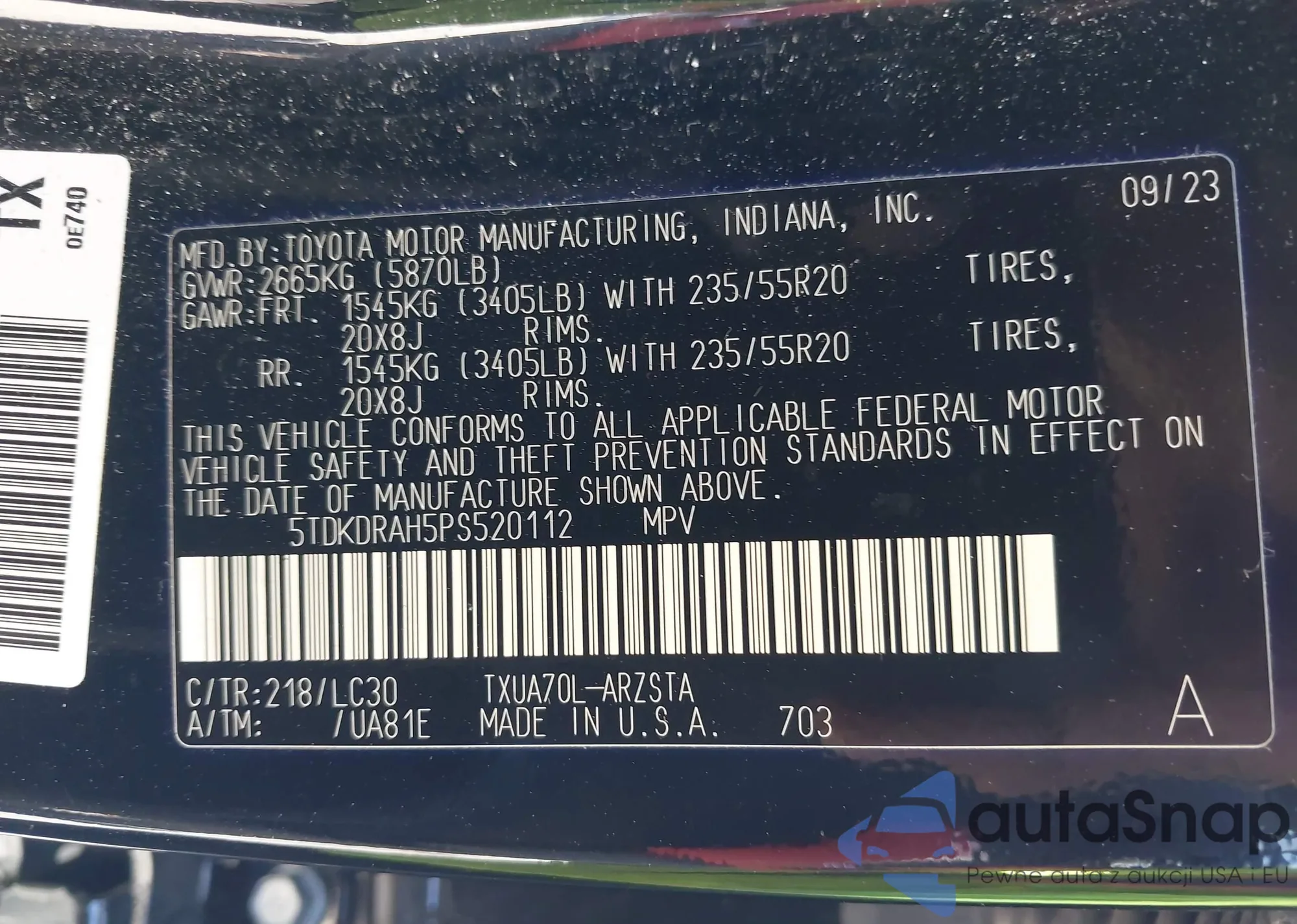 LOT: 43504767 VIN: 5TDKDRAH5PS520112