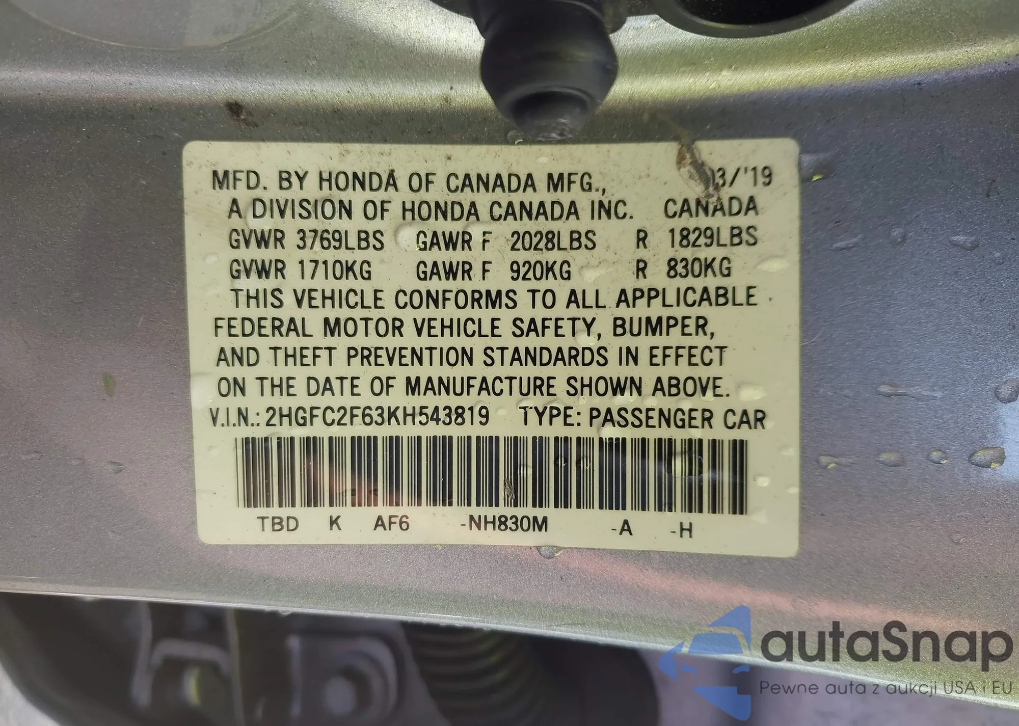 • VIN 2HGFC2F63KH543819