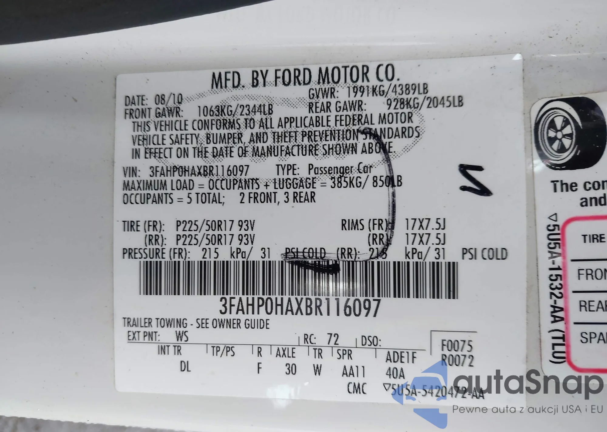 LOT: 43176051 VIN: 1FA6P8CF0H5354030