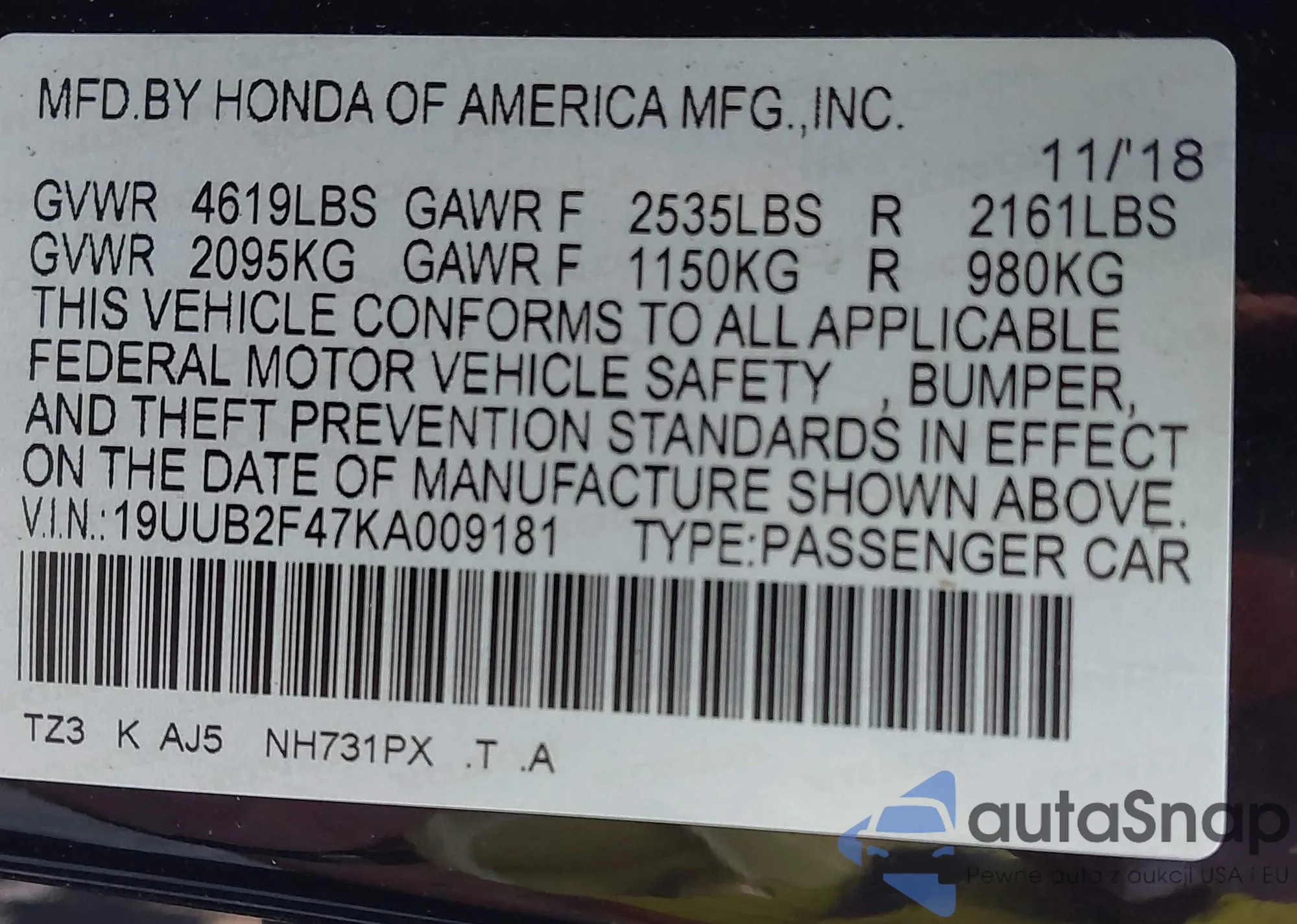 LOT: 43147716 VIN: 2HGFC2F63KH543819