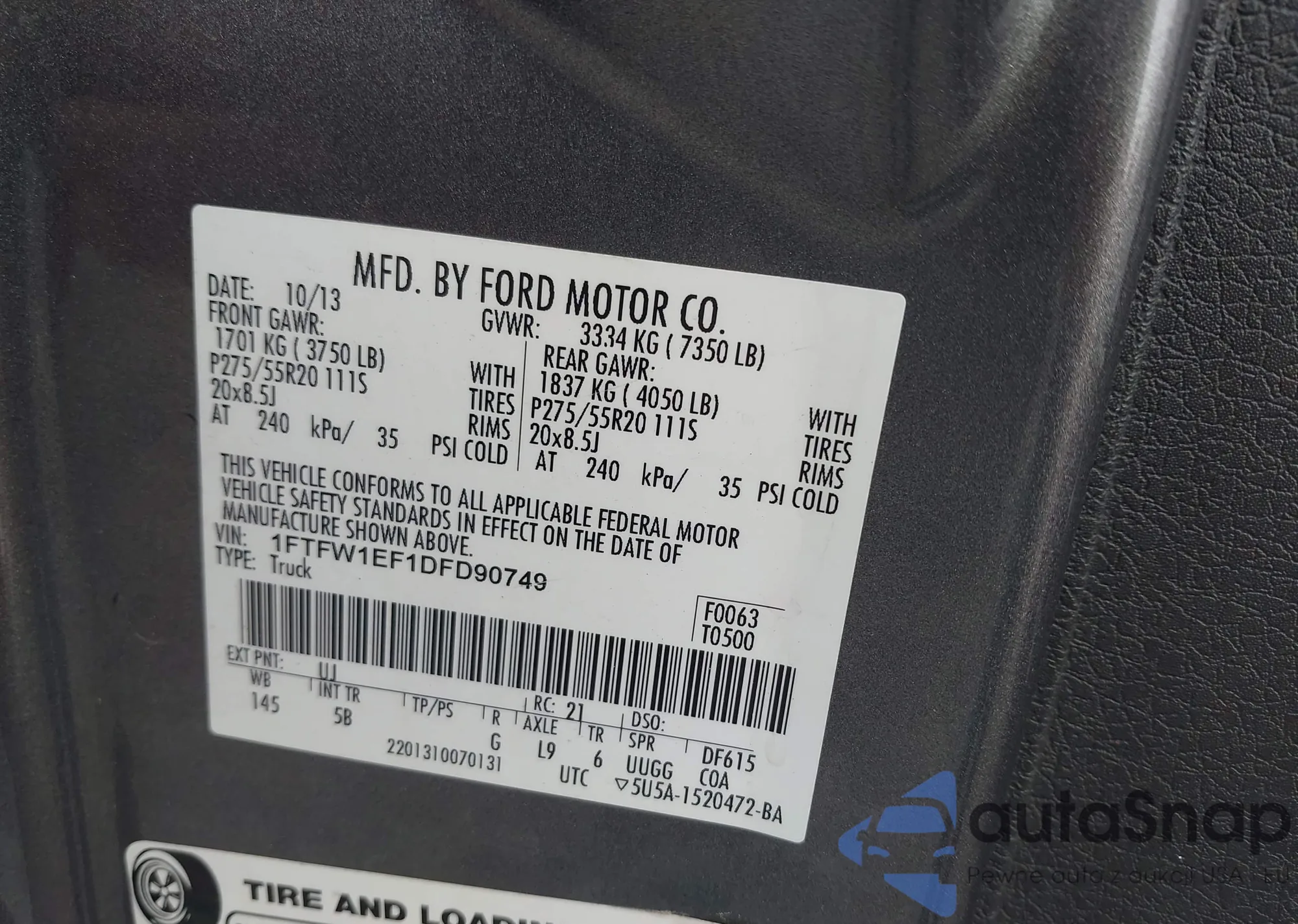 • VIN 1FTFW1EF1DFD90749