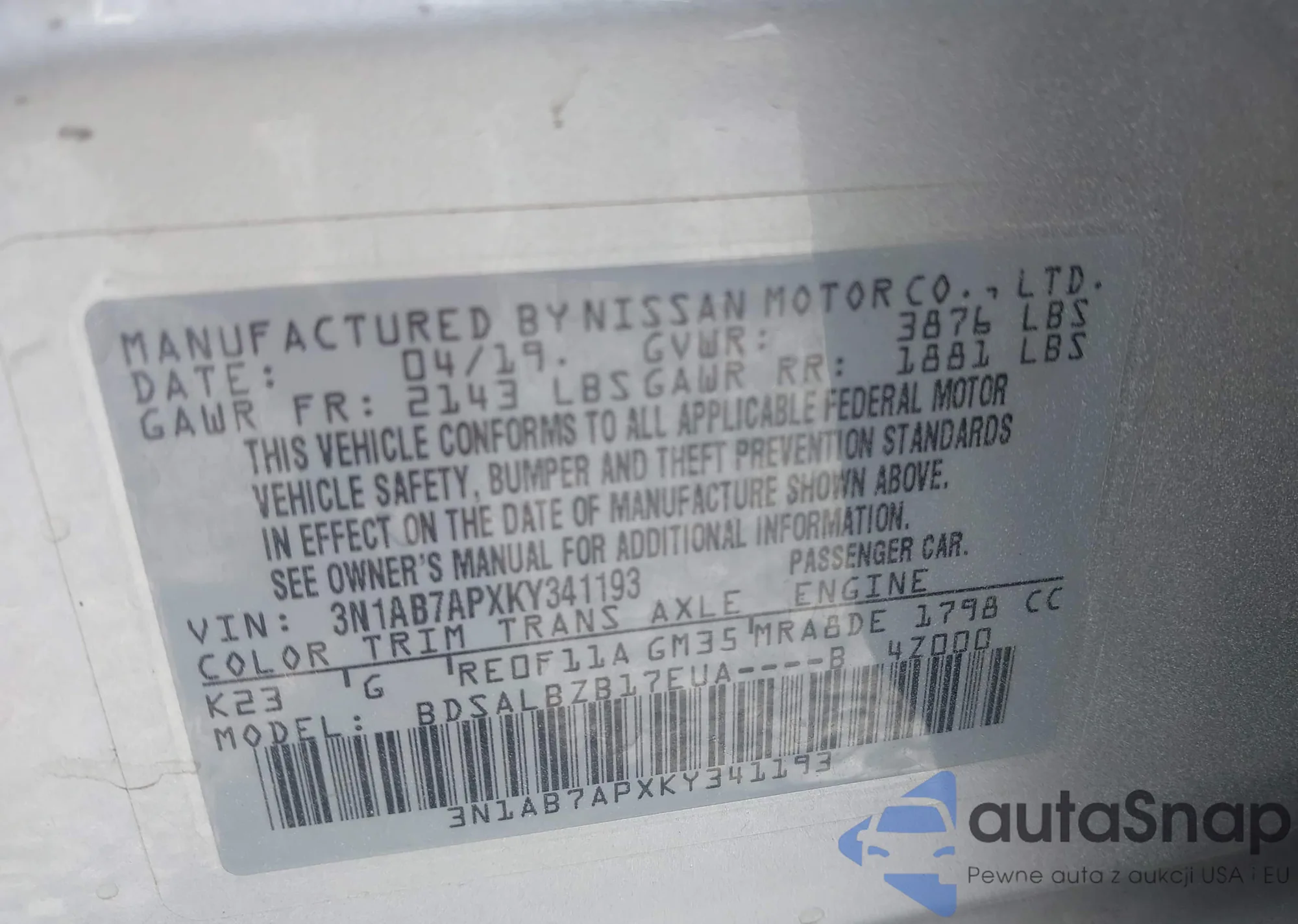 • VIN 3N1AB7APXKY341193